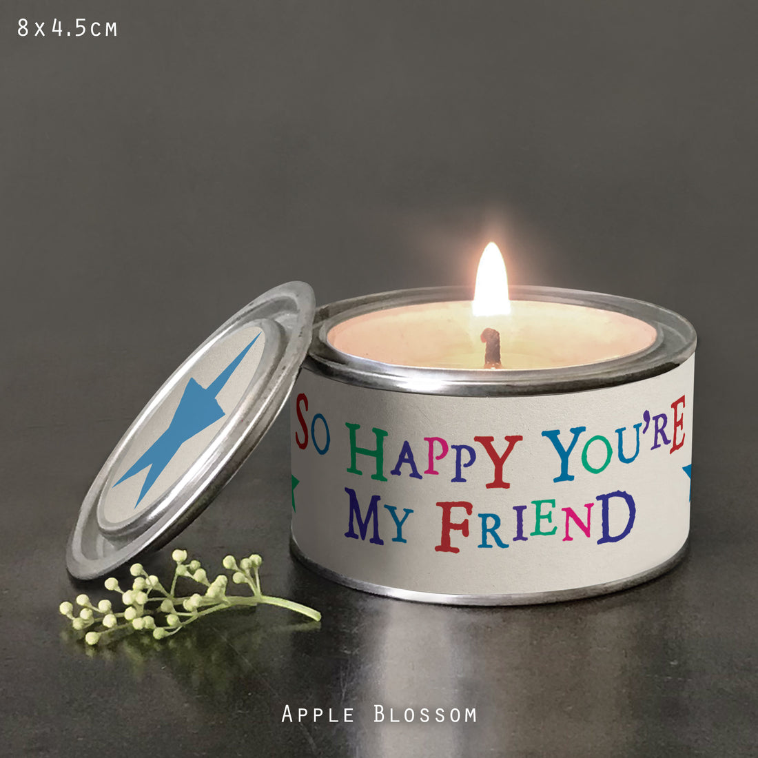 East Of India Scented Candle In Tin 'So Happy You're My Friend' Apple Blossom Fragrance East Of India Wonky Word Candle