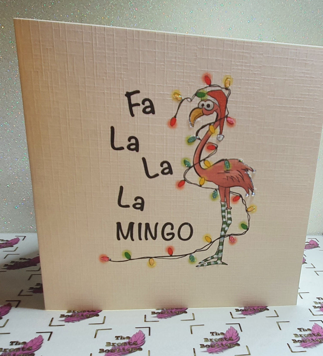 Flamingo Christmas Card ' Fa La La Mingo' Flamingo In Santa Hat And Christmas Lights Swarovski Crystal Detailing Linen Effect Free Delivery