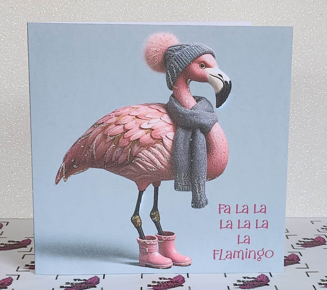 Flamingo Christmas Card ' Fa La La La Flamingo' Flamingo With Bobble Hat Scarf And Pink Wellies Glitter Detail Linen Effect Free Delivery