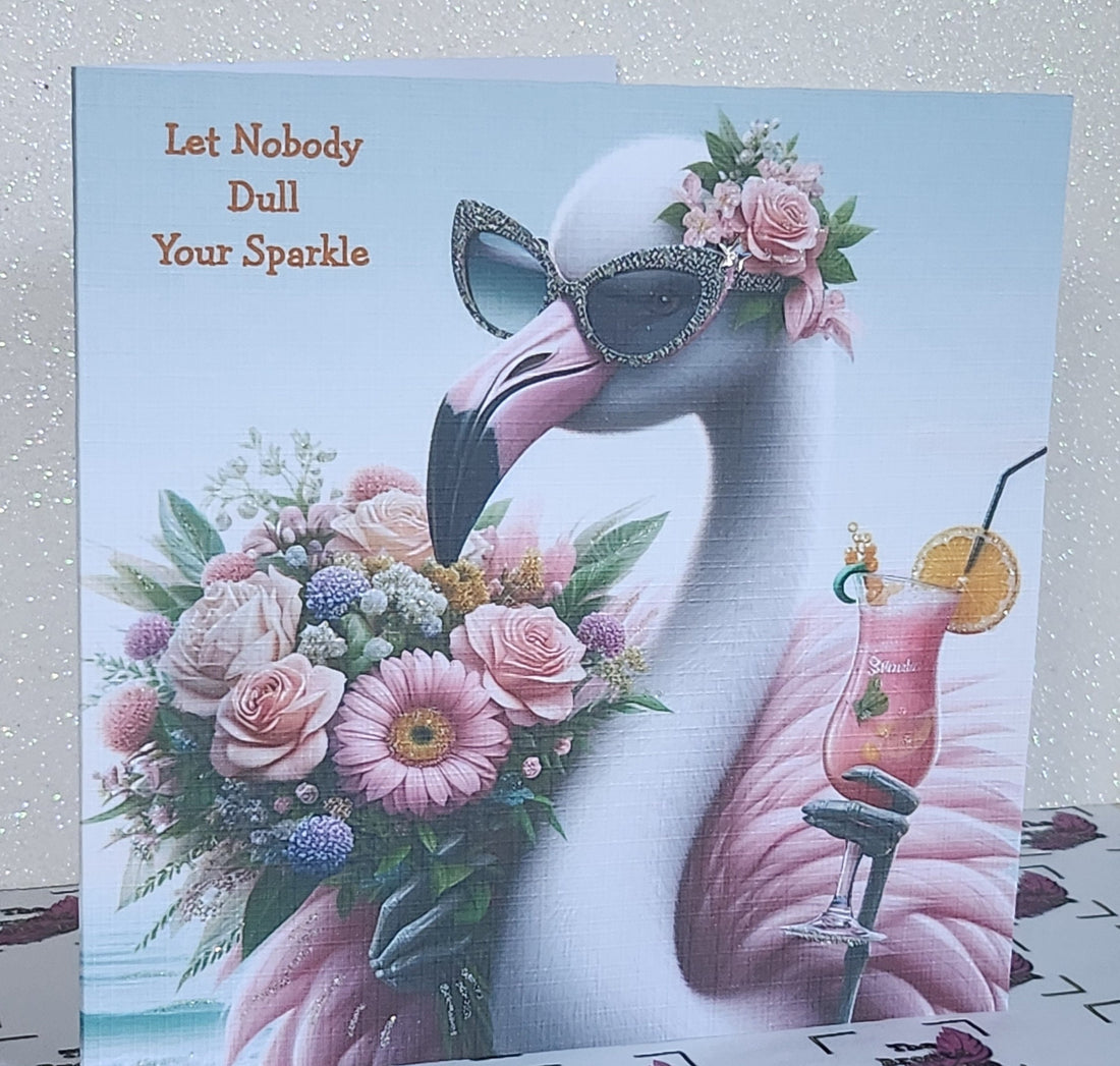 Flamingo Card 'Let Nobody Dull Your Sparkle' With Cocktail And Flowers Sunglasses Handmade White Linen Effect Card Square Free Delivery
