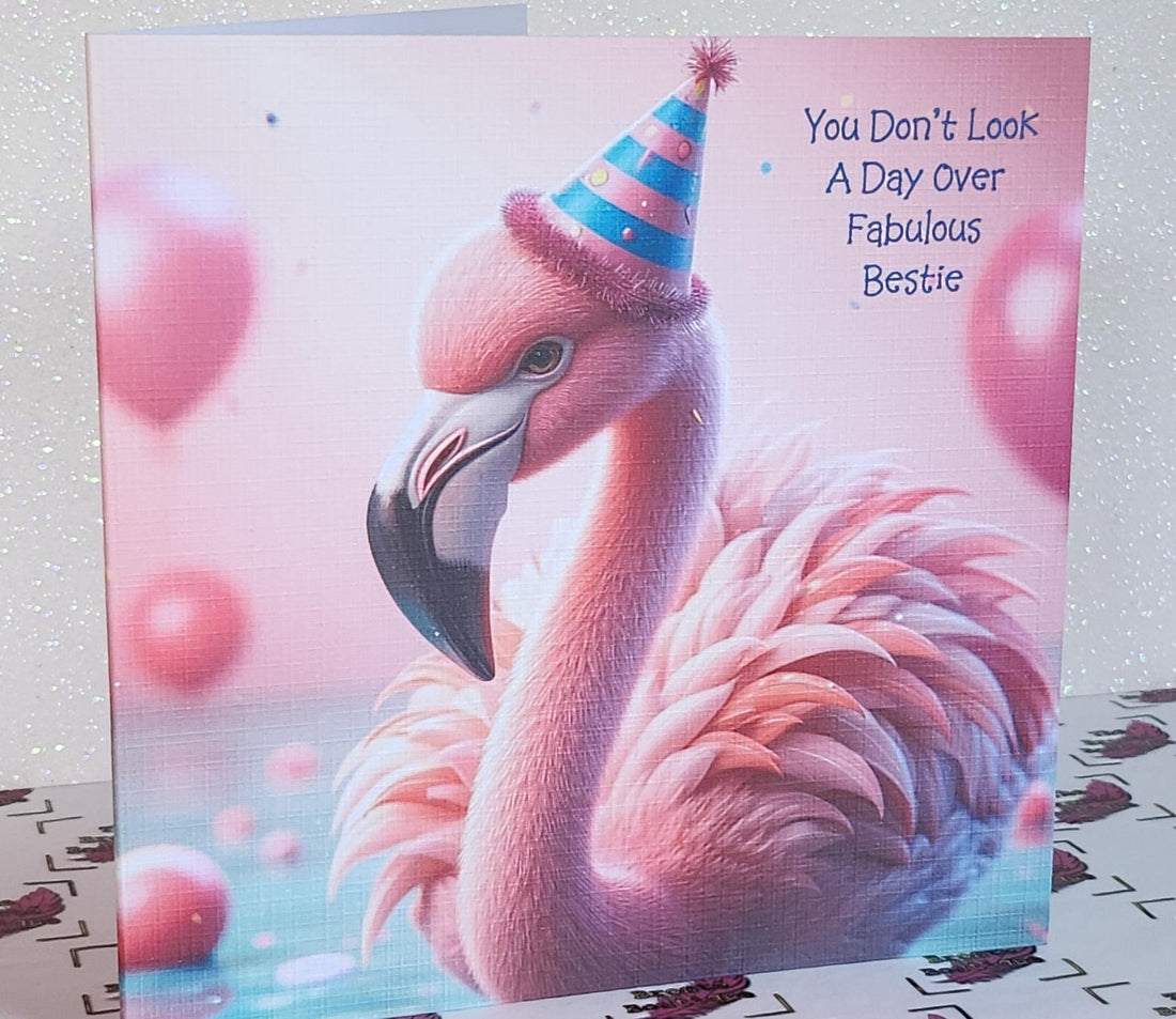 Flamingo Birthday Card Pink Flamingo With Birthday Hat 'You Don't Look A Day Over Fabulous' Handmade Linen Effect Card Square Free Delivery