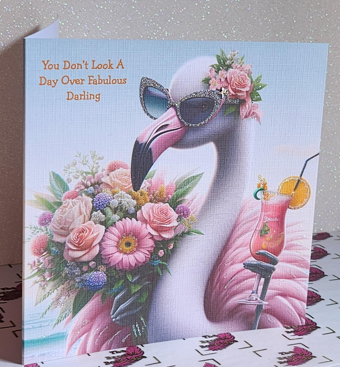 Flamingo Birthday Card Flamingo With Cocktail And Sunglasses 'You Don't Look A Day Over Fabulous' Handmade Linen Effect Square Free Delivery