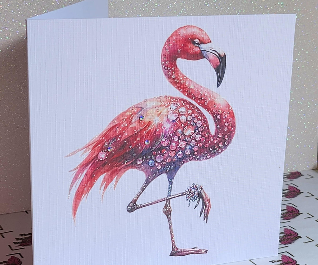 Flamingo Birthday Card Pink Flamingo With Swarovski Flat Backed Crystals Glitter Handmade Linen Effect Card Square Free Delivery Friend