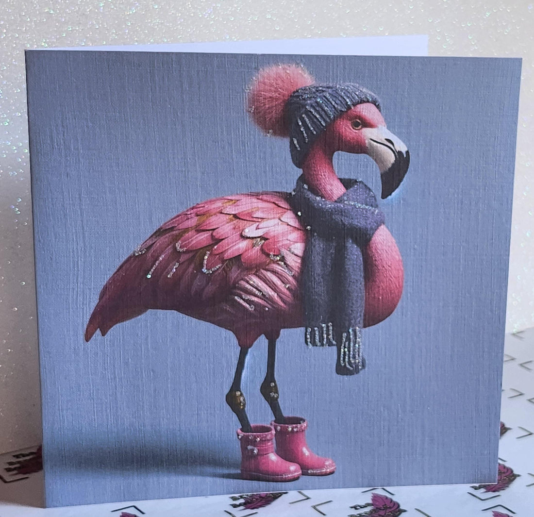 Flamingo Christmas Card ' Fabulous Festive Flamingo With Bobble Hat Scarf And Pink Wellies Glitter Detail Linen Effect Wife Free Delivery