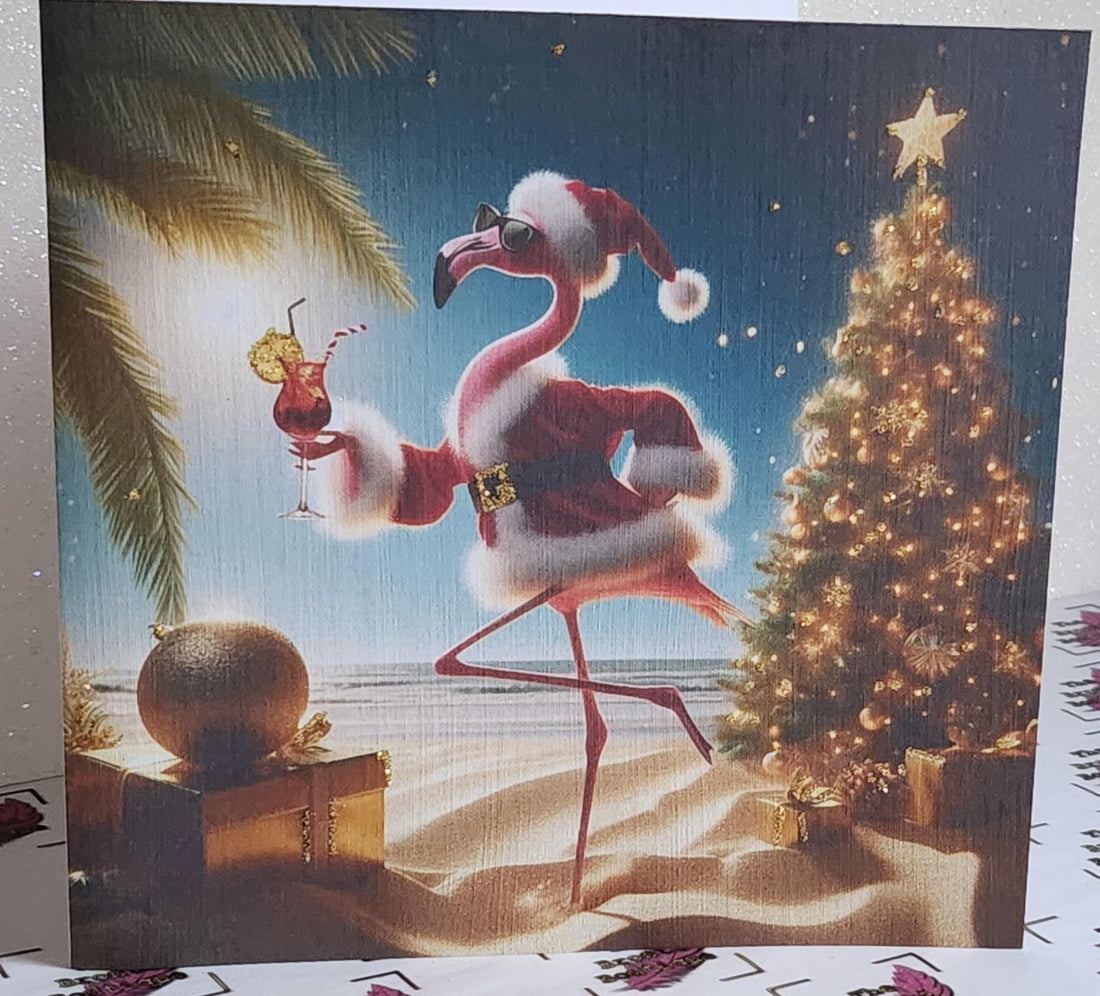 Flamingo Christmas Card 'Have A Flamazing Christmas' Flamingo Wearing Santa Outfit On Beach Gold Glitter Detail Linen Effect Free Delivery