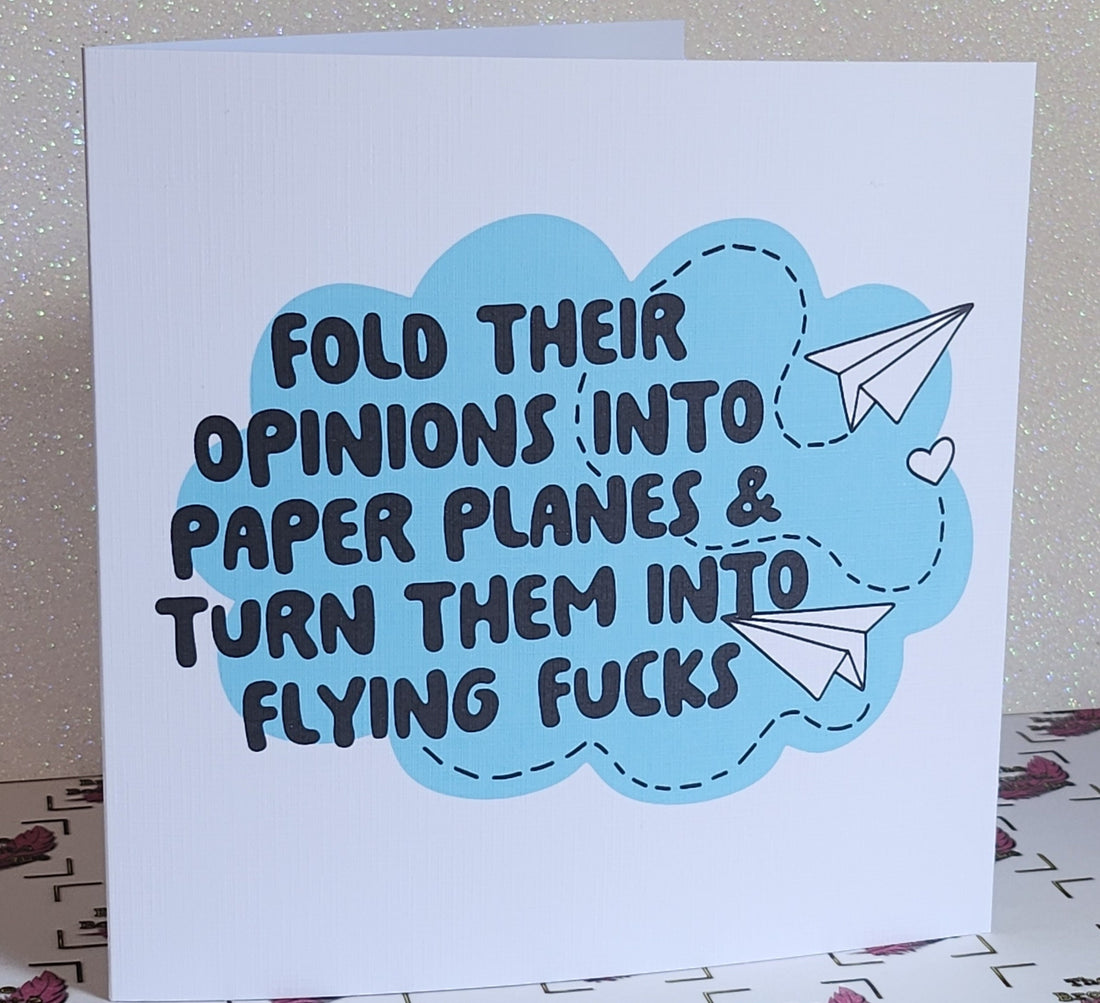 Funny Positive Affirmation Handmade Card 'Fold Their Opinions Into Paper Planes And Turn Them Into Flying F**ks'' Sarcasm Humour Free Delivery