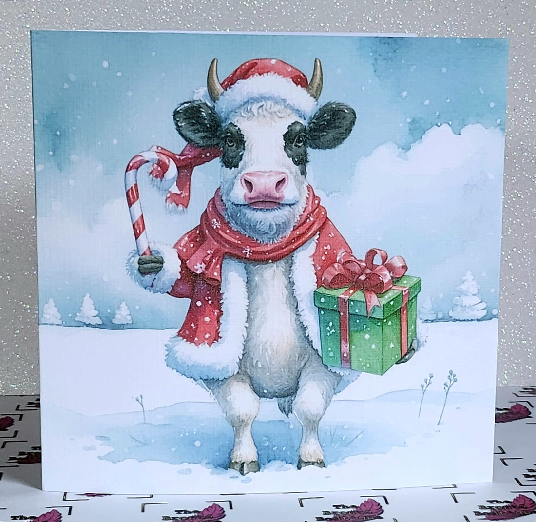 Highland Cow Christmas Card Highland Coo With Santa Hat Scarf And Holly Baby Handmade Glitter White Linen Effect Square Card Free Delivery
