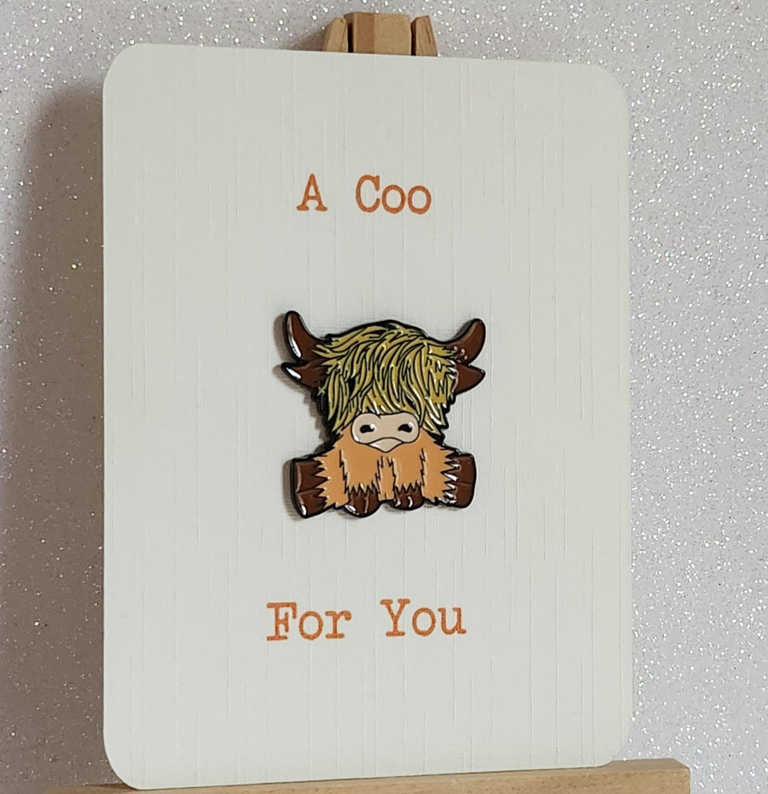 Highland Cow Enamel Pin Badge On Gift Card Brown And Orange Highland Coo Badge 'A Coo For Ewe' Friendship Birthday Positivity Mental Health