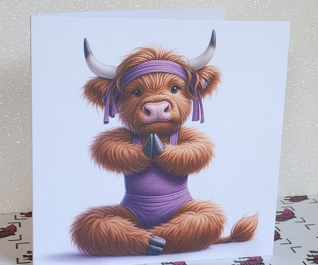 Highland Cow Yoga Card Highland Cow Doing Yoga Leotard Humour Friend Positivity Mental Health Handmade Linen Effect Square Free Delivery