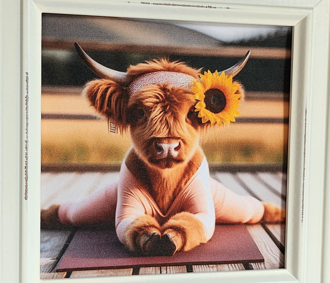 Highland Cow Yoga Card Highland Cow Doing Yoga Sunflower Humour Friend Positivity Mental Health Handmade Linen Effect Square Free Delivery