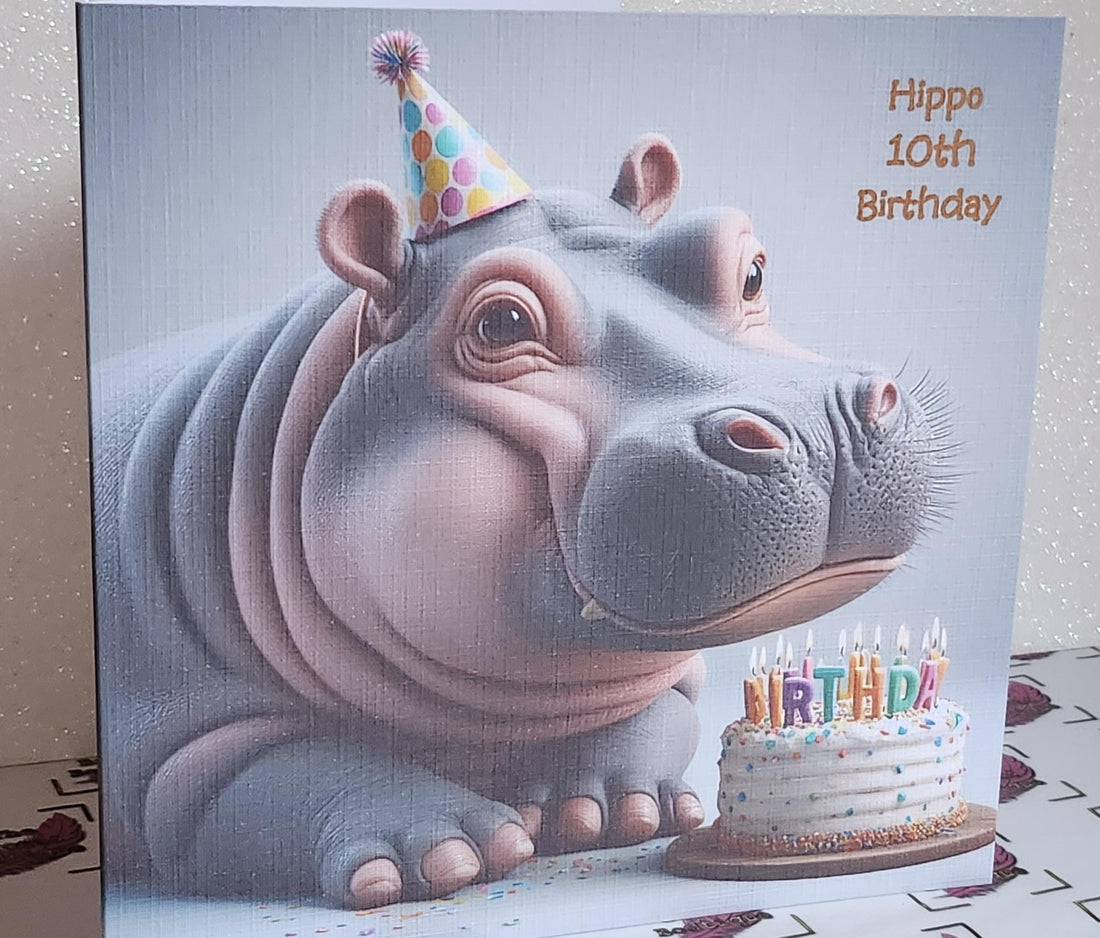 Hippo 10th Birthday Card Hippopotamus Wearing Birthday Hat With Birthday Cake Age Option Handmade Linen Effect Card Square Free Delivery