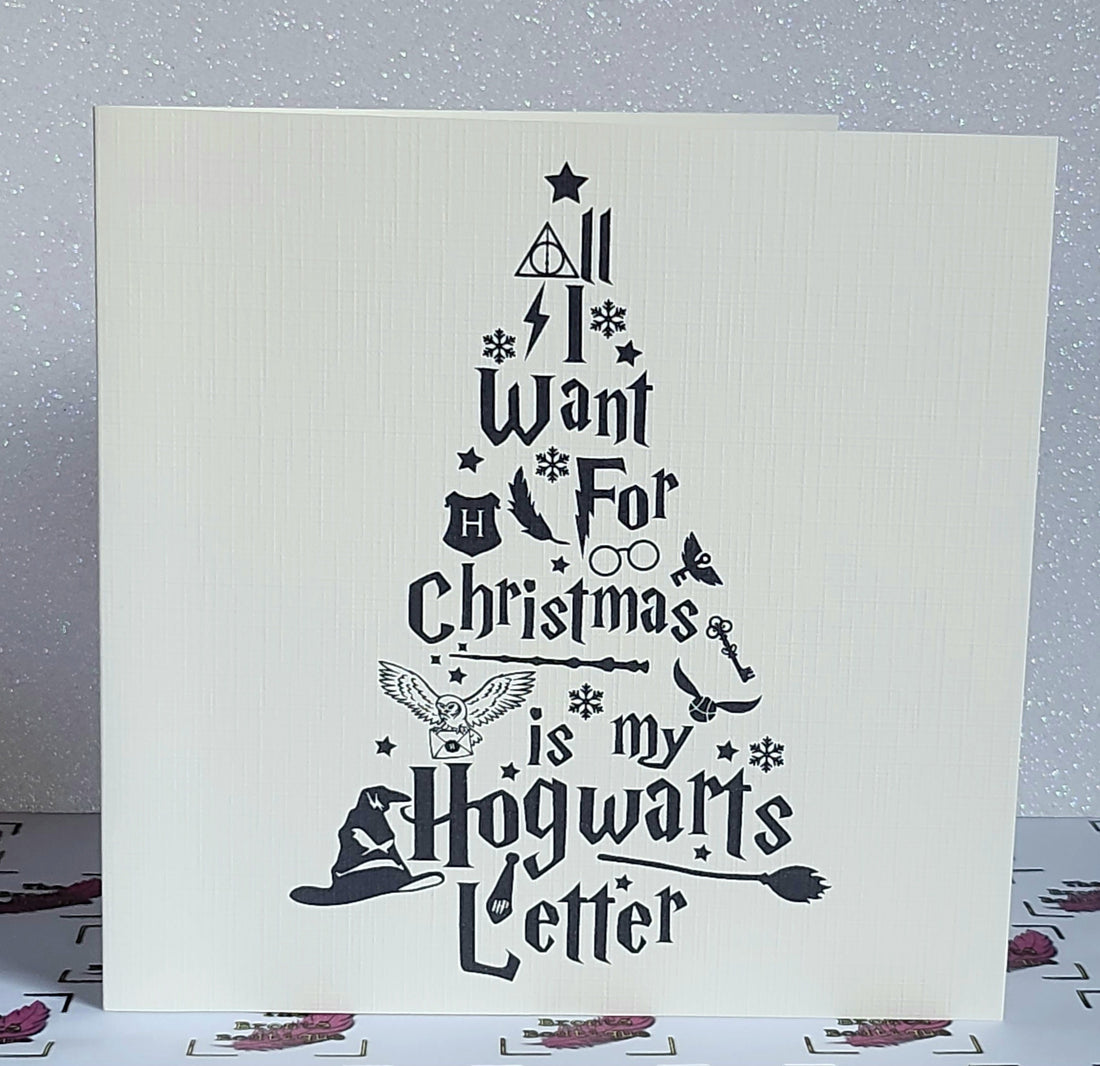 Hogwarts Christmas Card 'All I Want For Christmas Is My Hogwarts Letter' Square Ivory Linen Effect Harry Hermione Ron Free Delivery