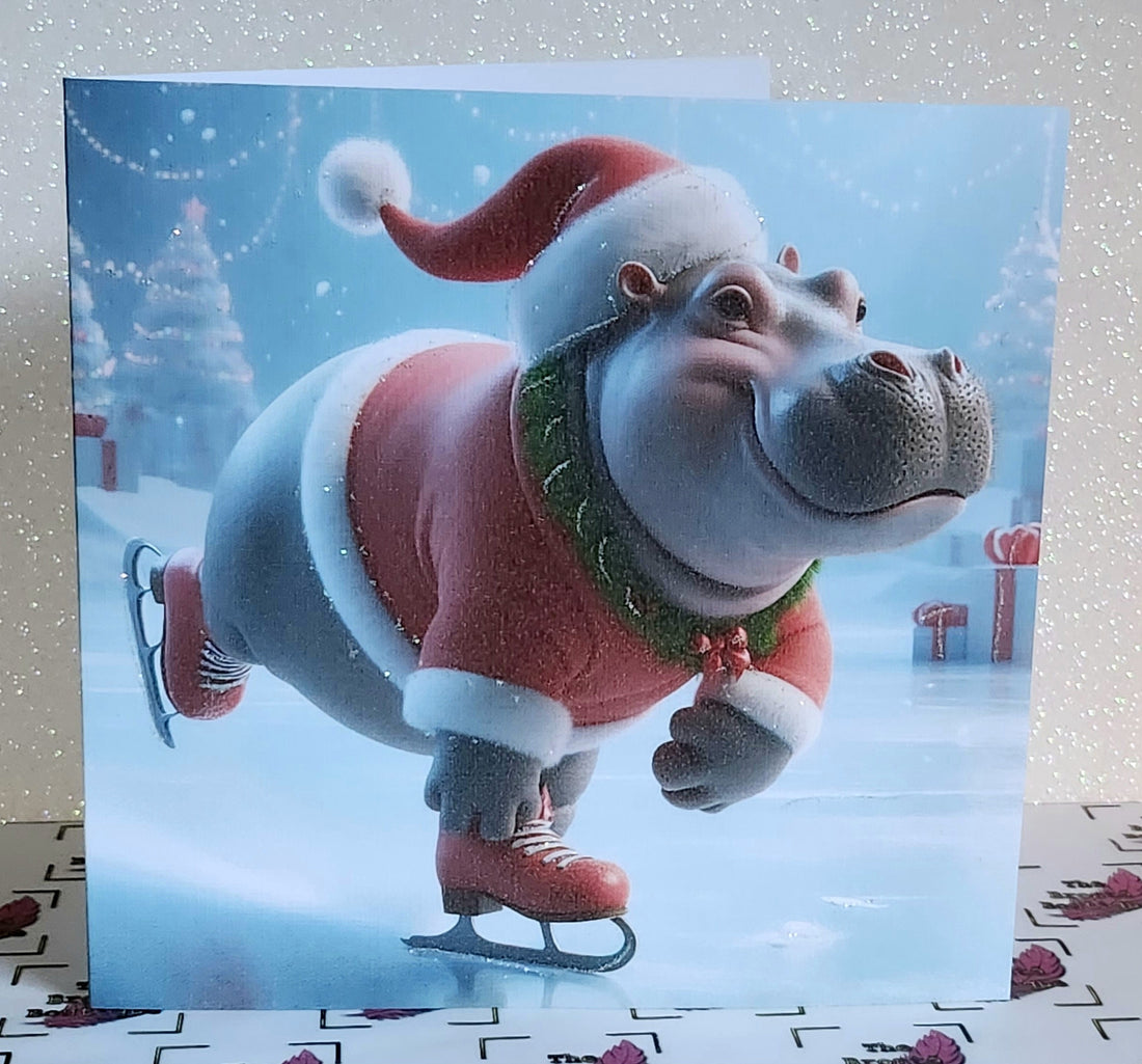 Hippo Christmas Card Ice Skating Santa Hippo Wearing Santa Outfit With Red Boots Glitter Detail Christmas Tree And Presents Free Delivery