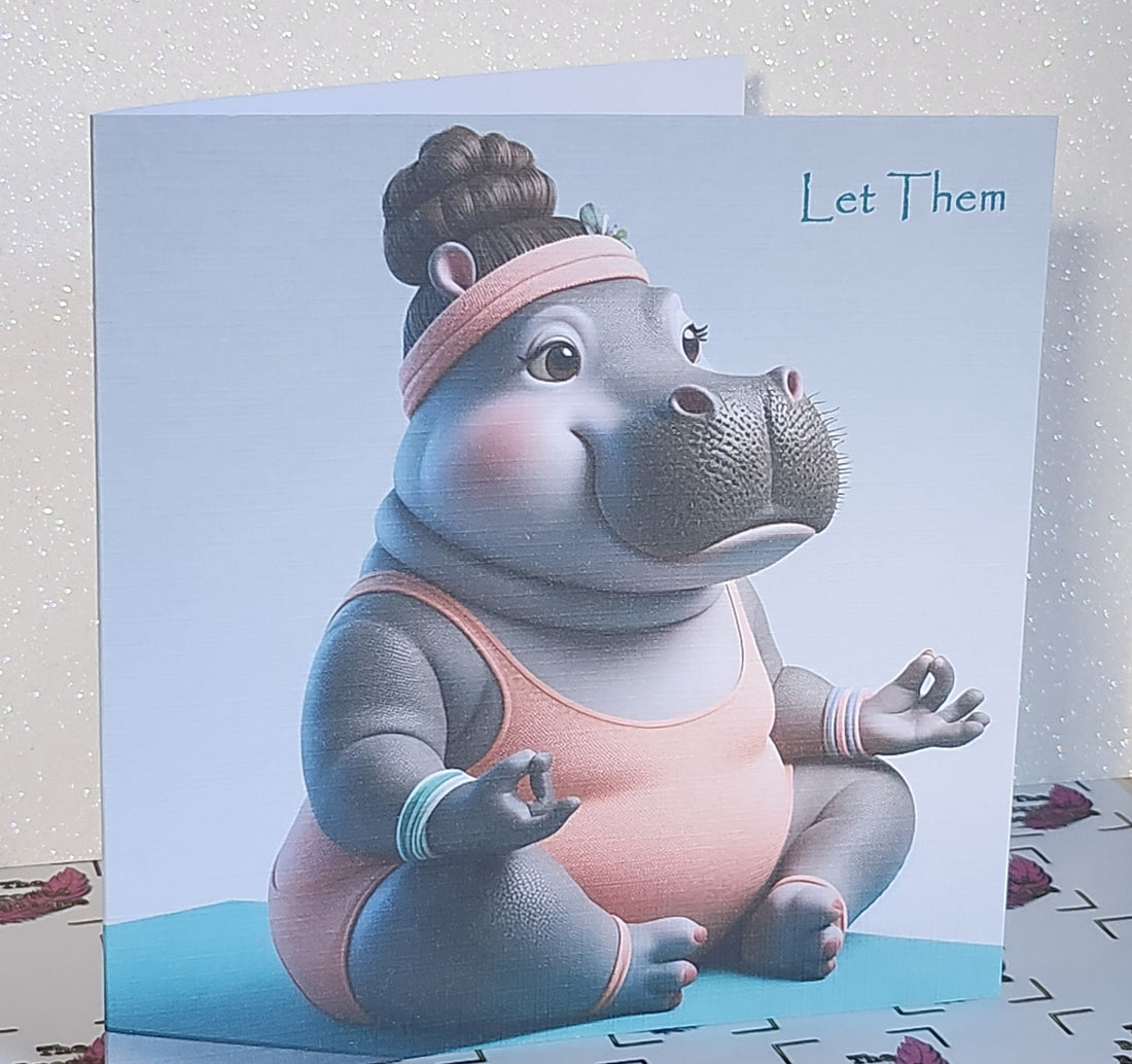 Hippo Yoga Card Hippopotamus Doing Yoga 'Let Them' Humour Positivity Mental Health Anti Bullying Handmade Linen Effect Square Free Delivery