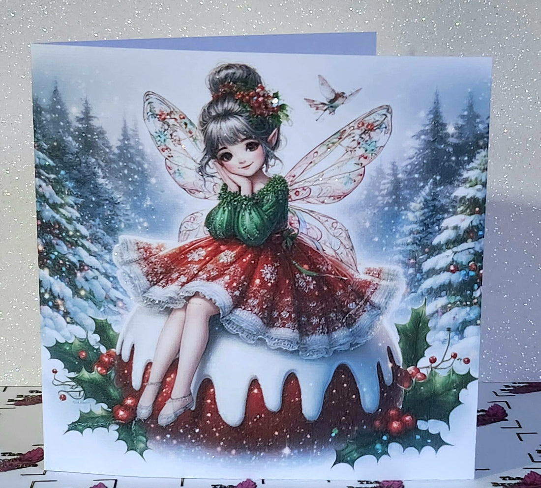 Christmas Fairy Card Handmade Fairy Sat On Christmas Pudding Genuine Swarovski Crystal Glitter Detail Linen Effect Square Card Free Delivery