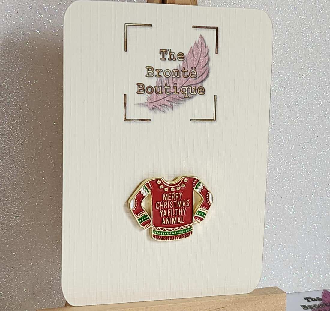 Christmas Enamel Pin Badge Red & Green Christmas Jumper On Gift Card 'Merry Christmas Ya Filthy Animal' Holidays Secret Santa Festive Kevin