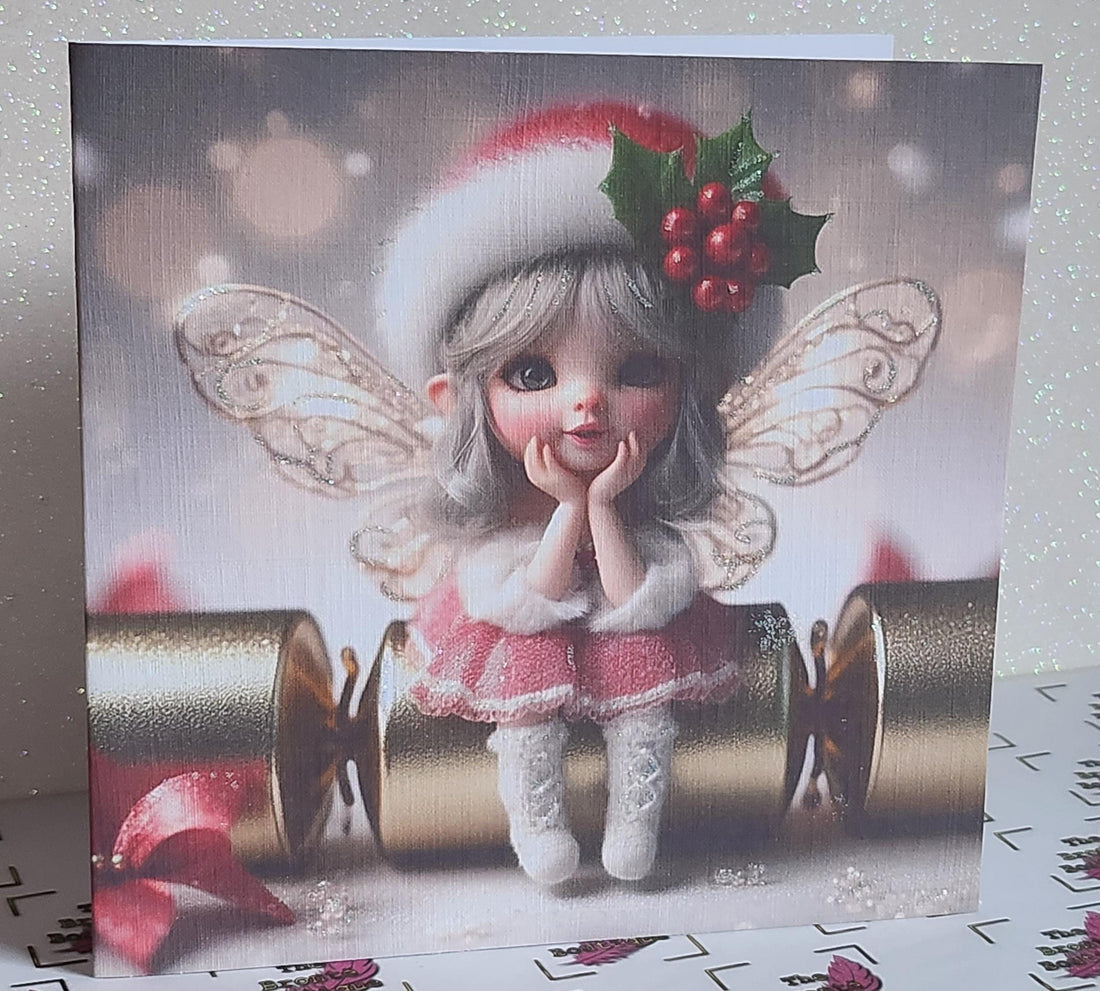 Christmas Fairy Card Fairy Sat On Christmas Cracker Wearing Santa Hat Daughter Grandaughter Glitter Linen Effect Holidays Free Delivery