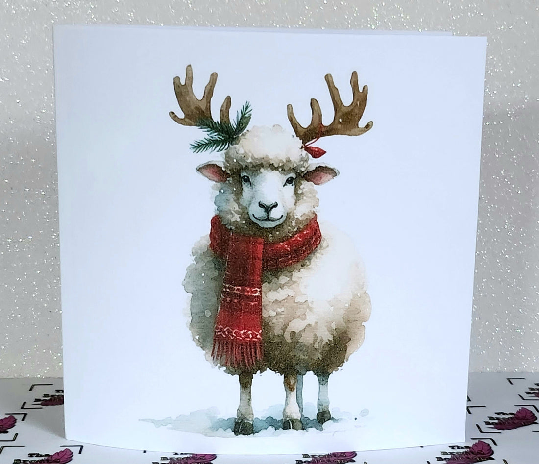 Christmas Reindeer Sheep Handmade Card With Scarf Woolly Sheep With Reindeer Antlers In Snow White Linen Effect Square Card Free Delivery