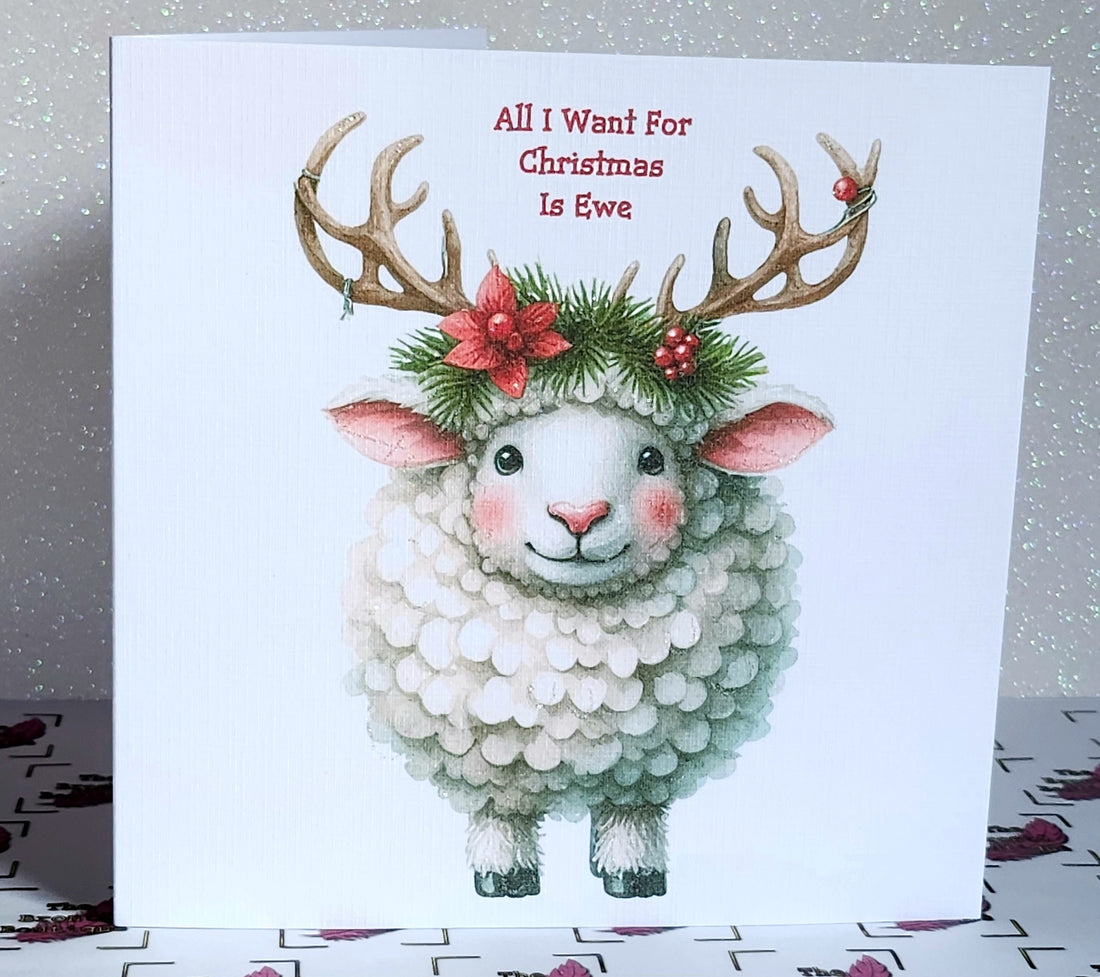 Christmas Reindeer Sheep Handmade Card 'All I Want For Christmas Is Ewe' Reindeer Antlers White Linen Effect Square Card Free Delivery