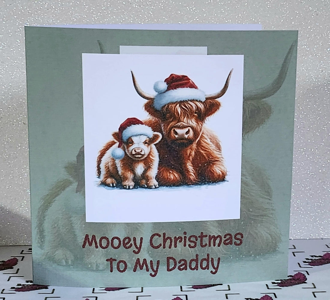 Daddy Highland Cow Christmas Card Highland Coo With Santa Hat And Child Mooey Christmas Handmade Linen Effect Square Card Free Delivery