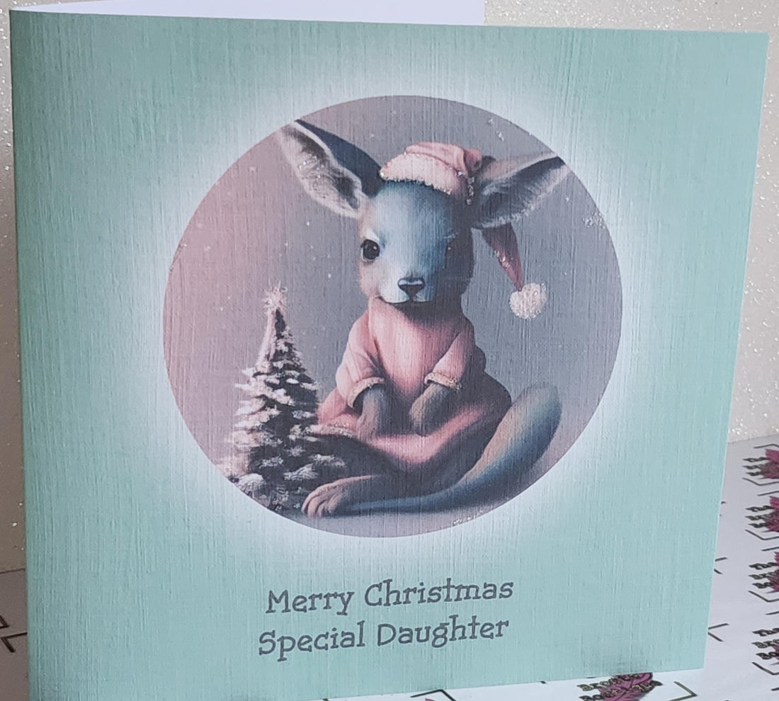 Daughter Christmas Card Cute Kangaroo Wearing Santa Hat With Christmas Tree Special Daughter Holidays White Linen Effect Card Free Delivery