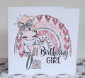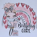A gorgeous card perfect for sending Birthday Wishes to that sassy Birthday Girl!! The ivory 300gsm card measures 125mm x 175mm and features a gorgeous watercolour birthday girl with a sprinkle of glitter and the most fabulous handbag decorated with a genuine Swarovski flat backed crystal. She is surrounded by a sparkly pink rainbow decorated with a sprinkling of glitter and is holding a yummy cupcake.