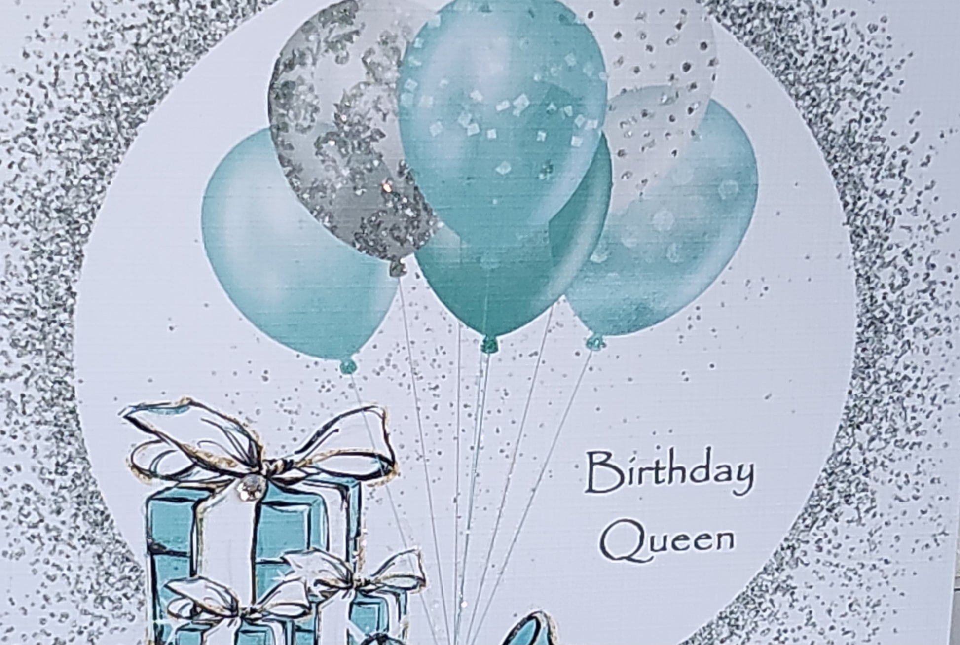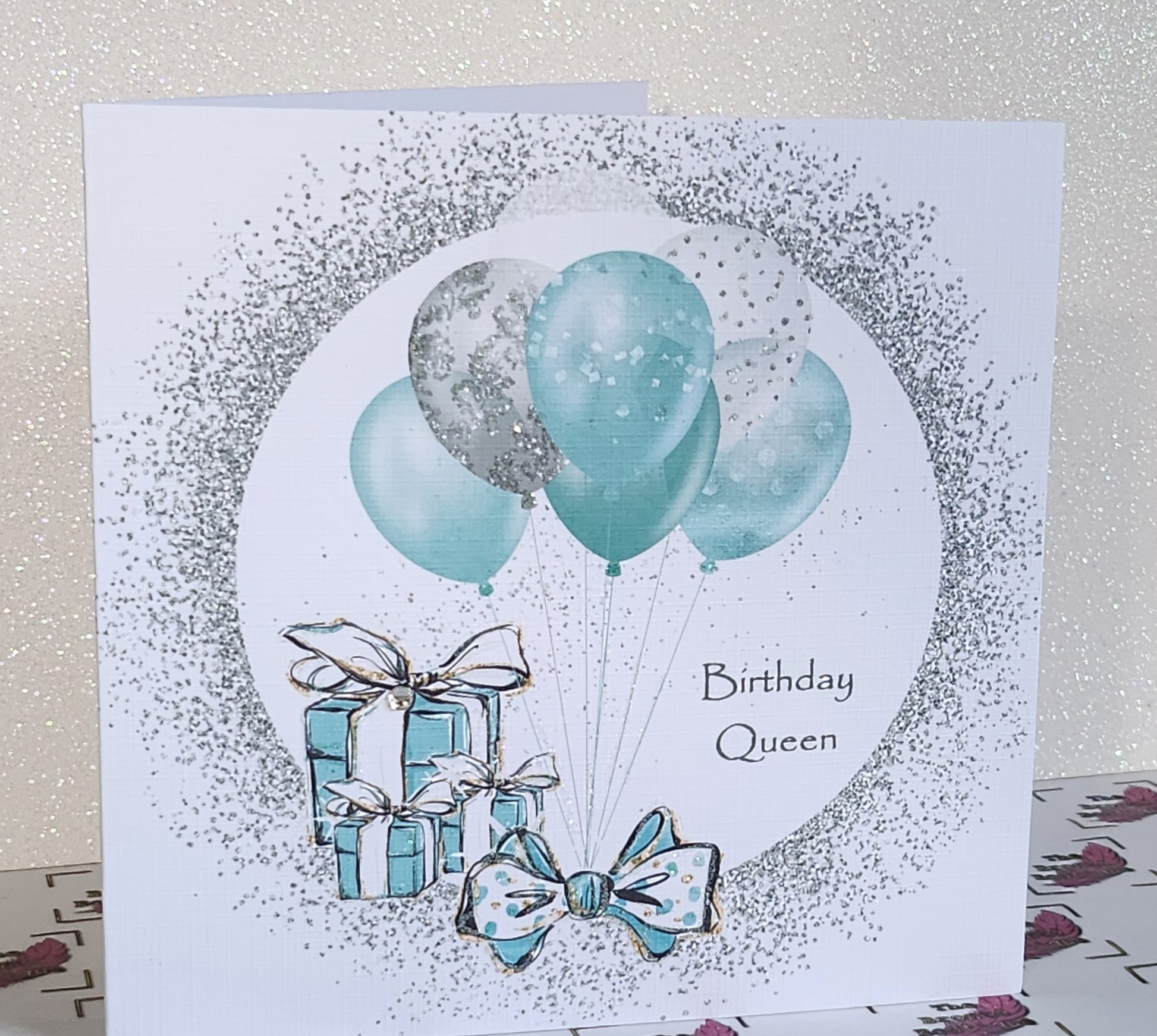 Birthday Queen Handmade Card Square Mint And Silver Balloons And Birthday Gifts Swarovski Crystal Glitter Happy Birthday Free Delivery