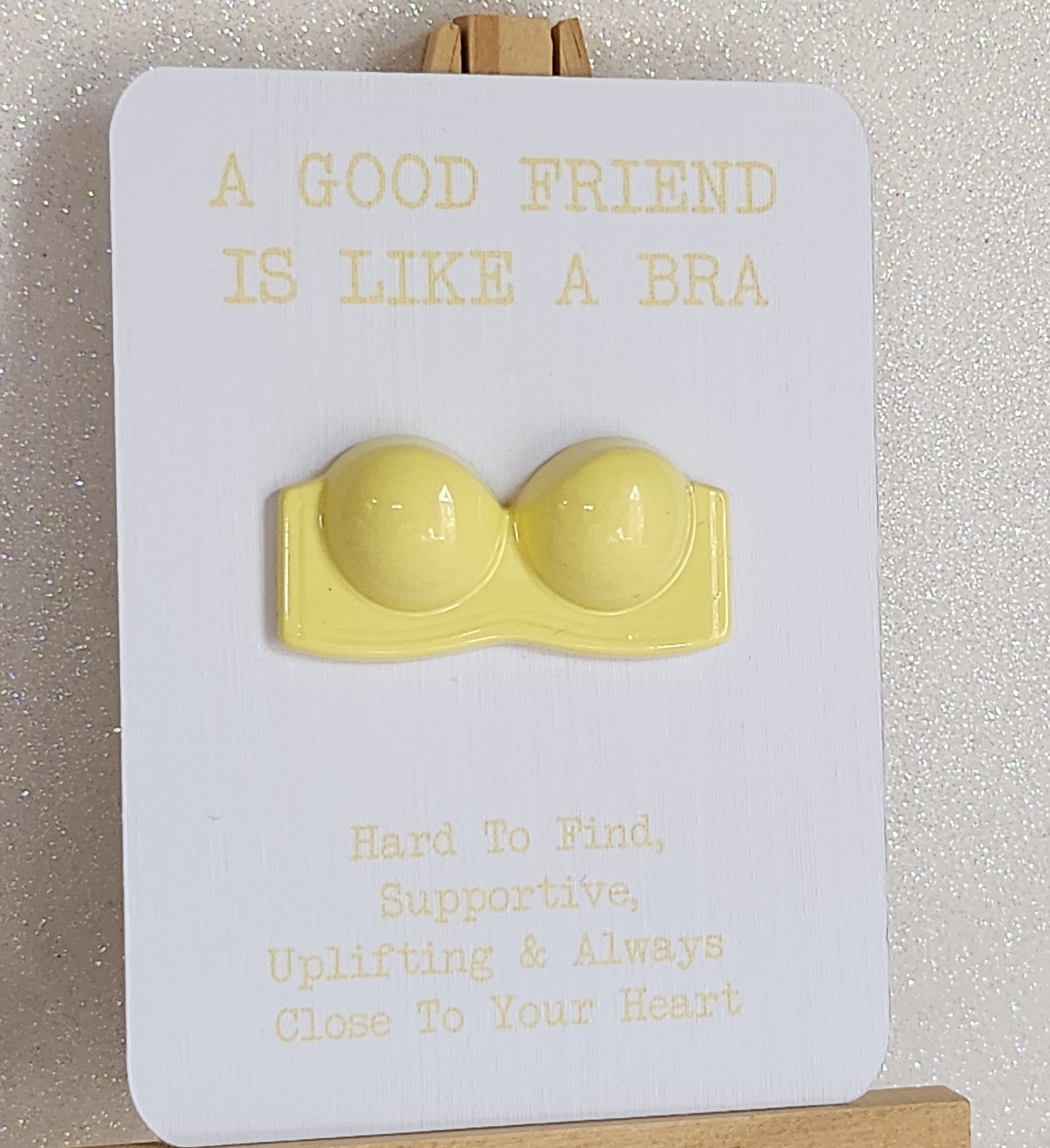 A gorgeous and cheeky pocket hug to give a friend in need a positive boost. This lush pale yellow resin bra is set on a white linen effect gift card which has the wording ' A Good Friend Is Like A Bra, Supportive, Uplifting & Always Close To Your Heart ' on it. A lovely and thoughtful gift for someone who needs a bit of encouragement and a virtual hug.