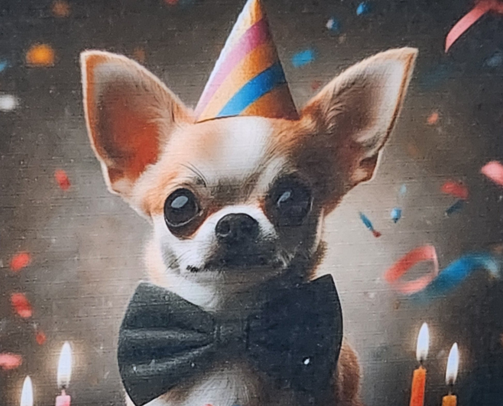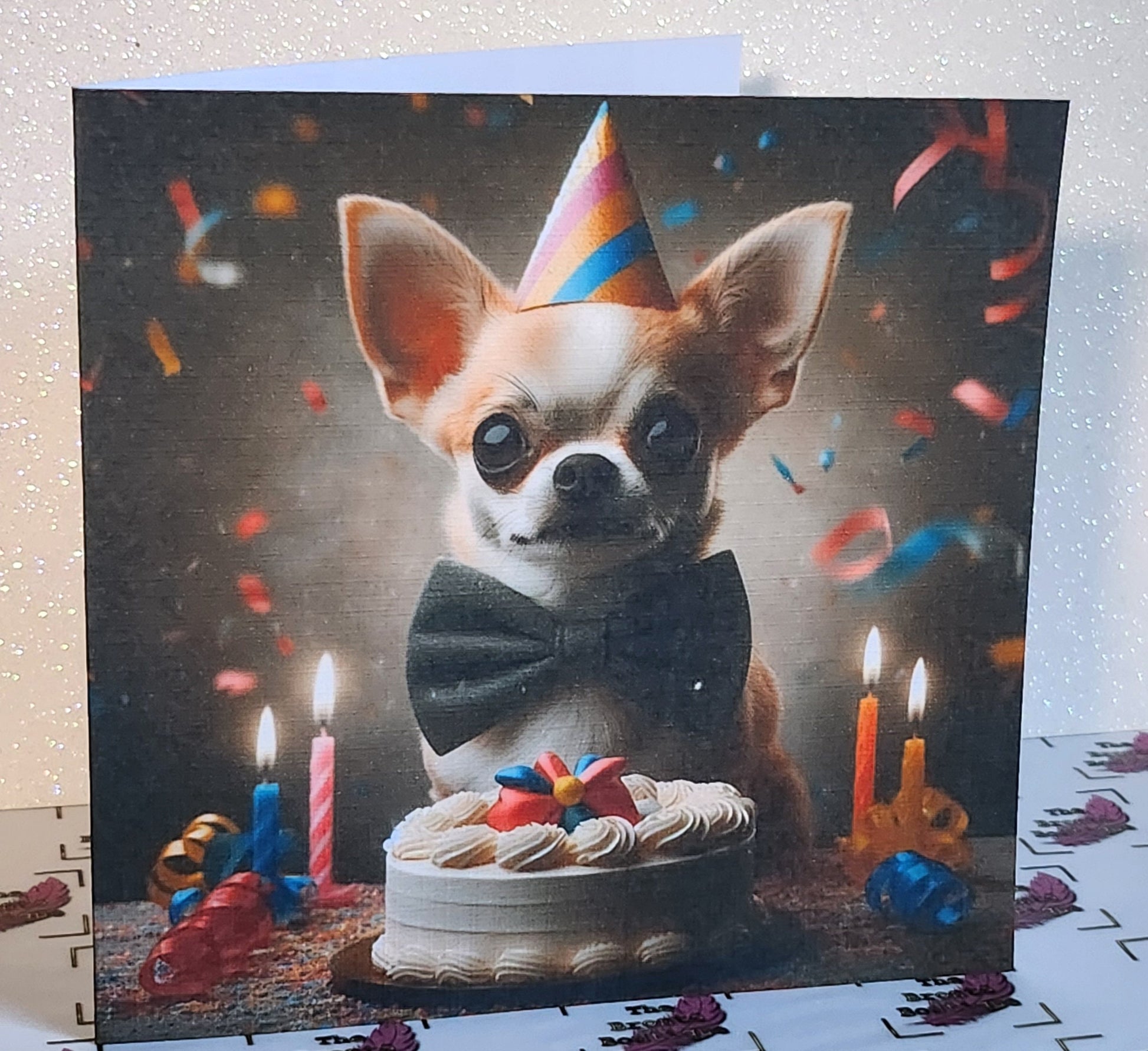 Chihuahua Birthday Card Chihuahua Wearing Birthday Hat & Bow Tie Happy Birthday Son Daddy Handmade Linen Effect Card Square Free Delivery