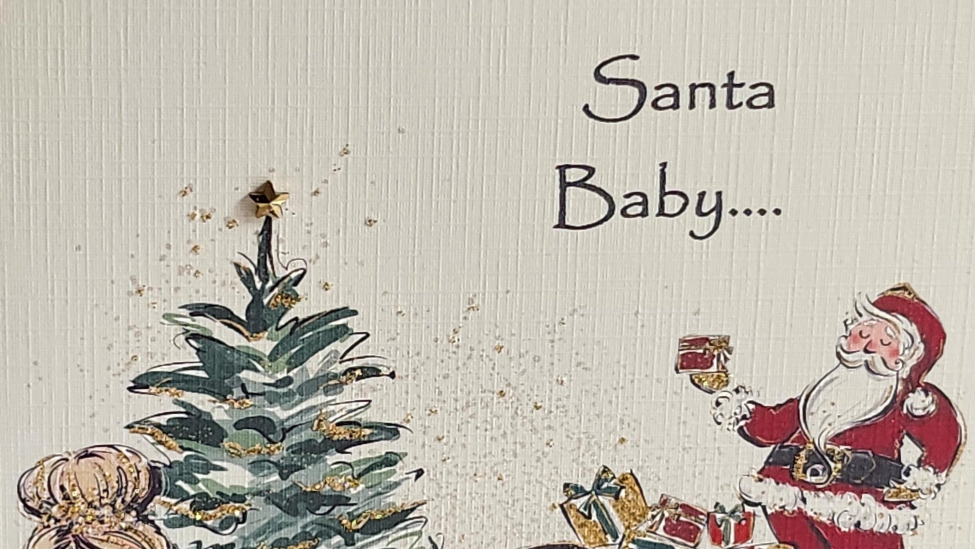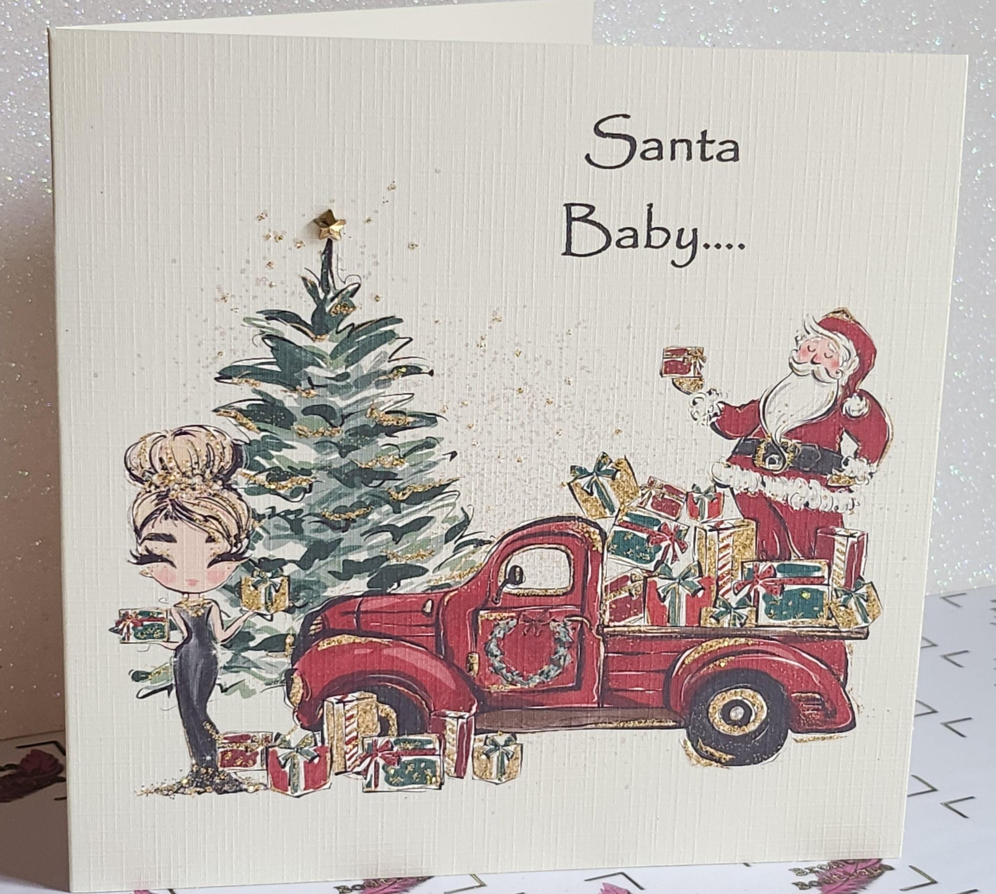 A gorgeous card perfect for that sassy and fabulous woman in your life. The ivory linen effect 300gsm card measures 150mm x 150mm and features a gorgeous watercolour glamourous lady in a little black dress holding Christmas gifts. She is surrounded by a stunning Christmas tree which has a genuine Swarovski flat backed crystal in the shape of a star on top. Santa is also there in his festive red truck. This stunning card is embellished with a sprinkling of glitter and has the wording 'Santa Baby' on it.