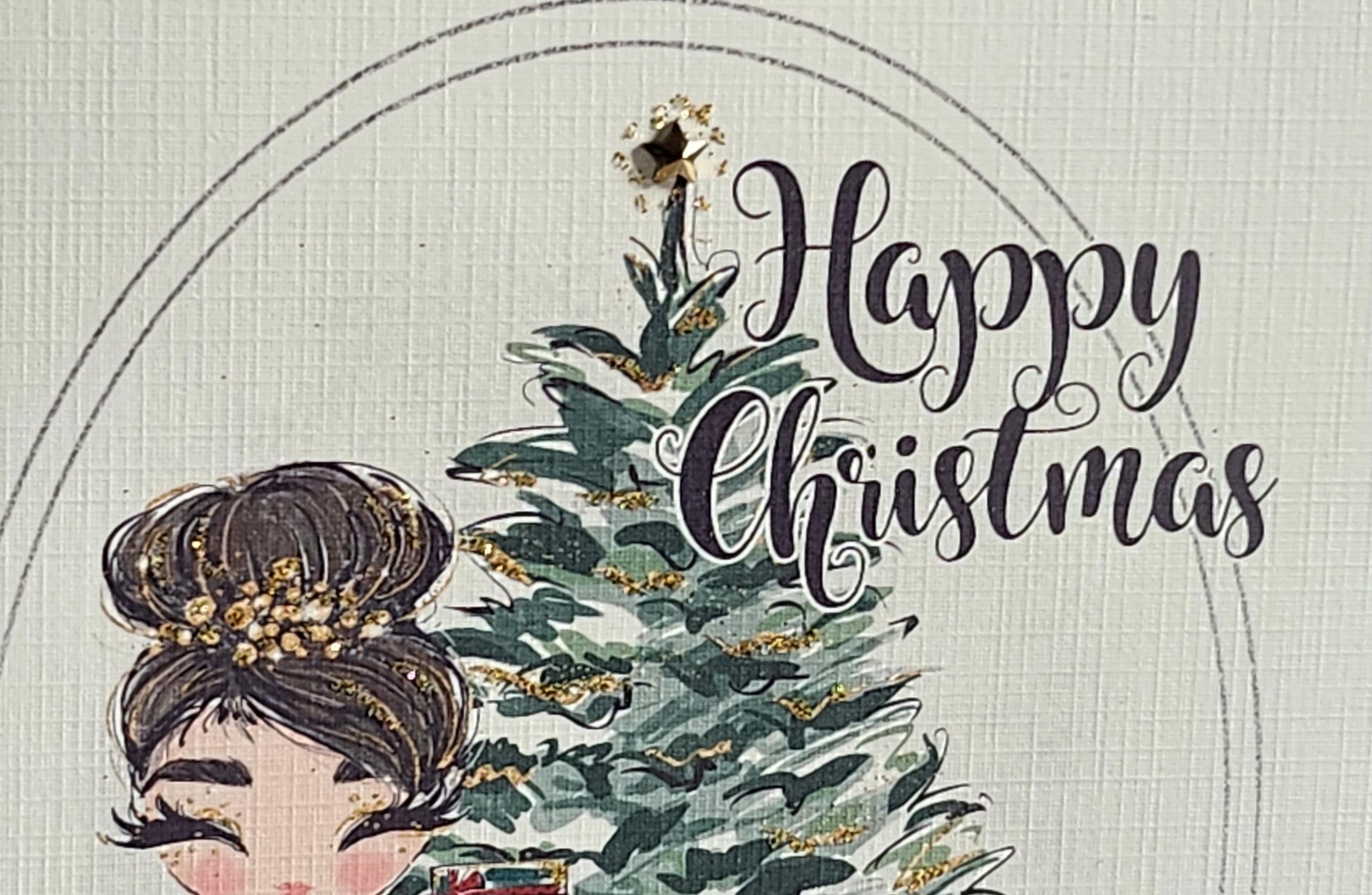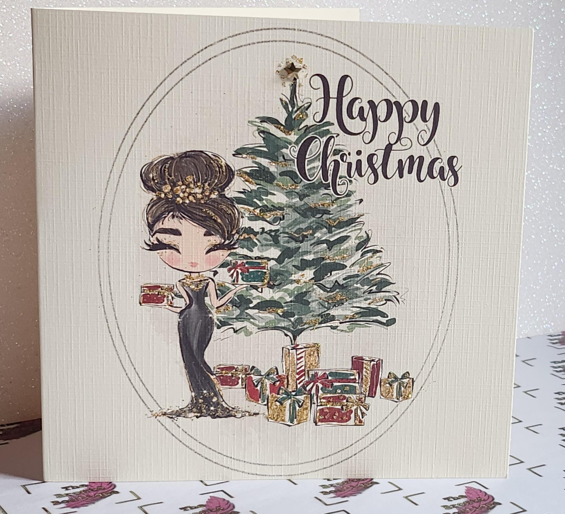 A gorgeous card perfect for that sassy woman and fabulous woman in your life. The ivory linen effect 300gsm card measures 150mm x 150mm and features a gorgeous watercolour glamourous lady in a little black dress holding Christmas gifts. She is surrounded by a stunning Christmas tree which has a genuine Swarovski flat backed crystal in the shape of a star on top. This stunning card is embellished with a sprinkling of glitter. It has the wording 'Happy Christmas' on it.