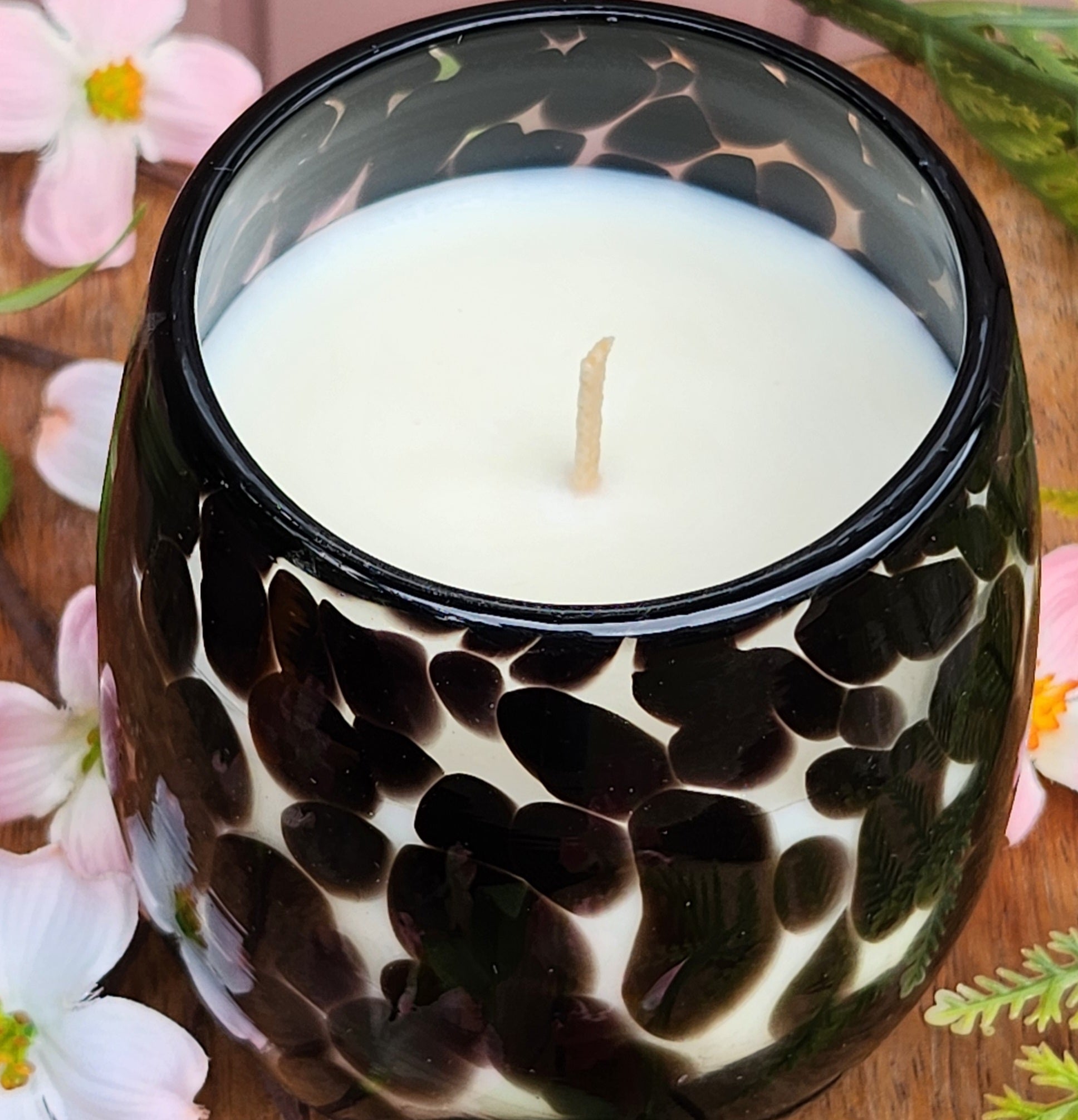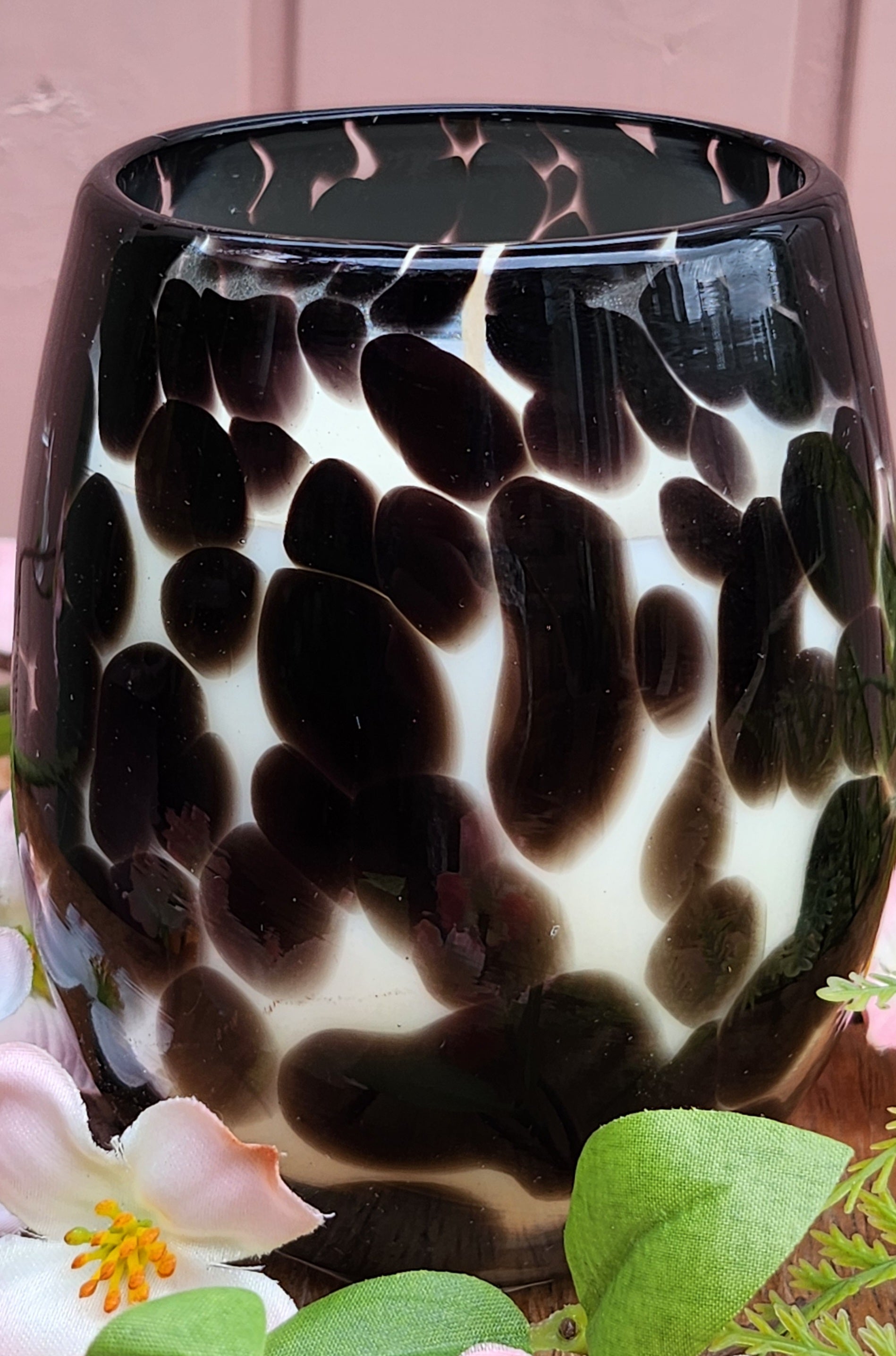 Cocosoy Luxury Scented Candle Handpoured Black Dalmation Print Stemless Wineglass Jar Citrus Coriander Fragrance
