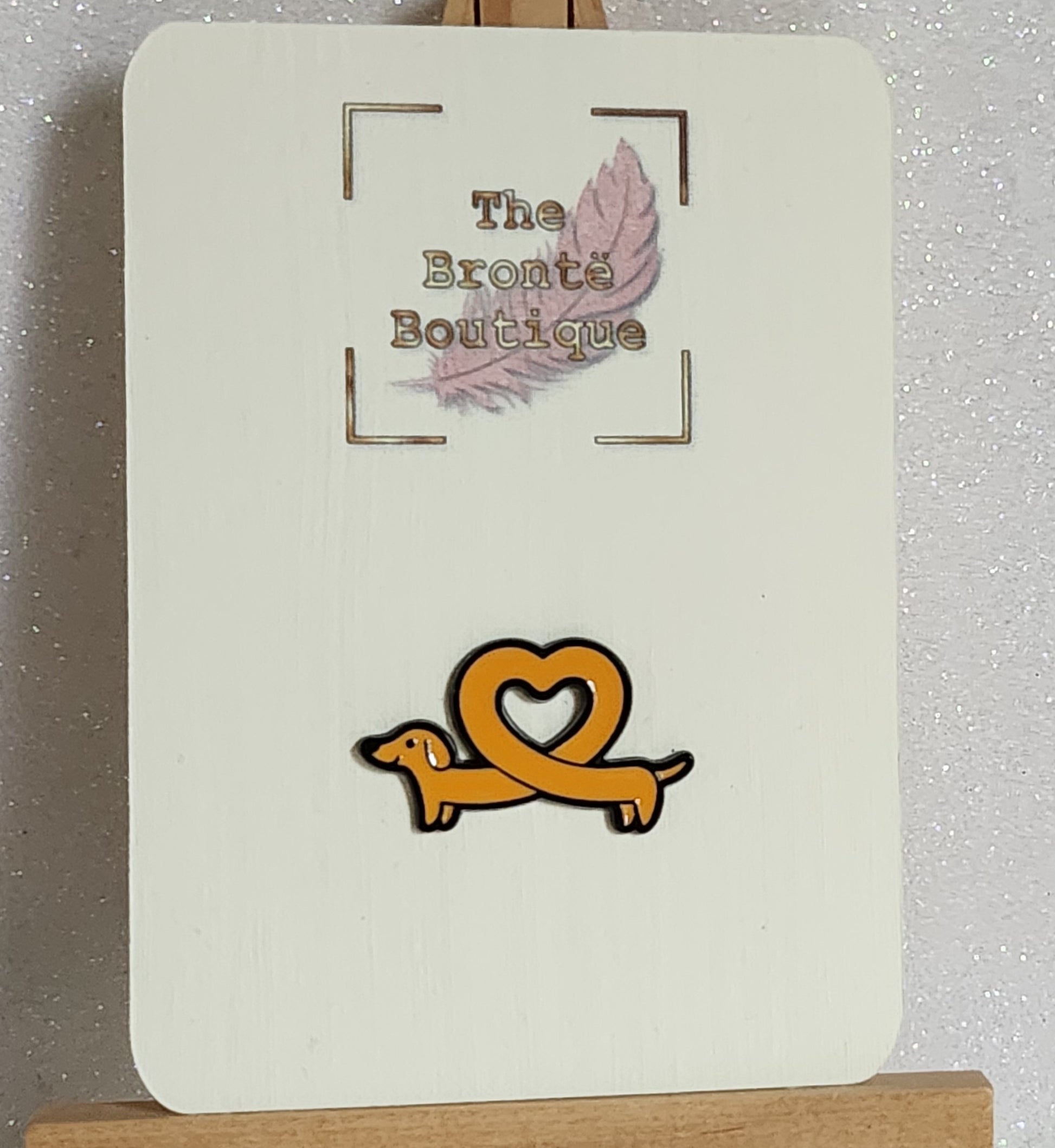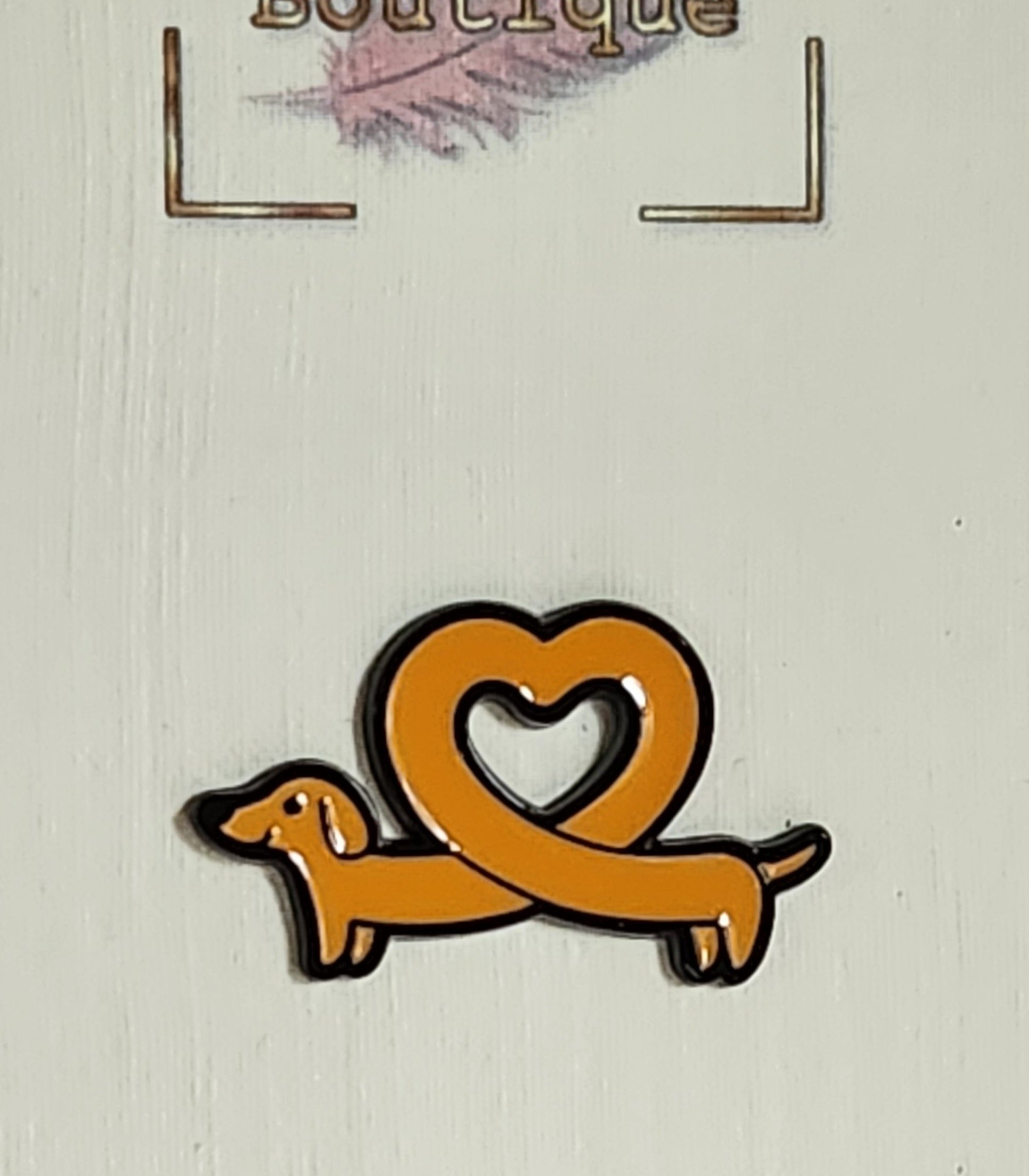 A gorgeous badge perfect for that Dachshund lover! This lovely enamel badge is in the shape of a dachshund with a cute love heart in the middle. It is set on a cream linen effect gift card. A lovely and thoughtful gift.