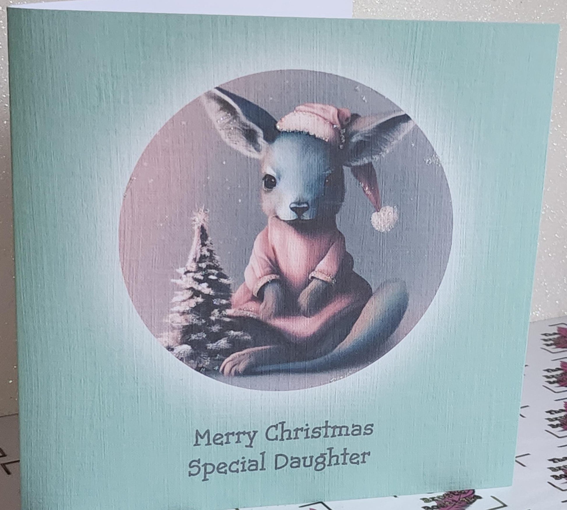 A quirky and unique card perfect for wishing your Special Daughter a Merry Christmas. This ivory 300gsm card measures 150mm x 150mm and features a detailed image of a super cute Kangaroo wearing a Santa hat along with the wording 'Merry Christmas Special Daughter'. I'm thrilled to say this unique design is exclusive to The Bronte Boutique and is embellished with a sprinkling of glitter.