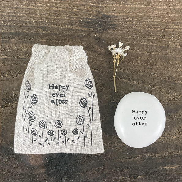 This lovely drawstring gift bag from East Of India would be perfect for adding the final gift wrapping touch to your East Of India Porcelain Pebbles. With the wording 'Happy Ever After' this would add the perfect finishing touch to that special gift.