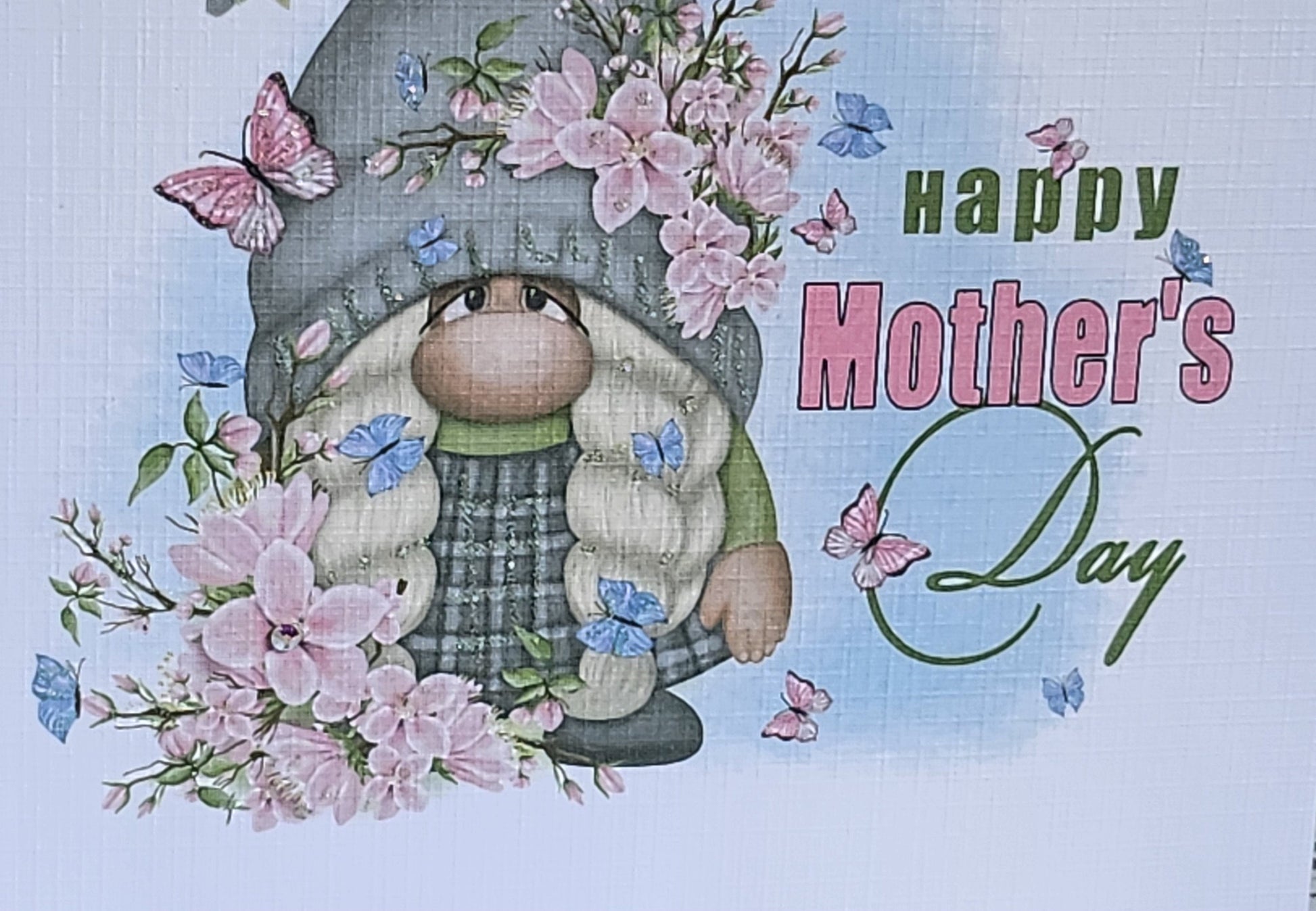A super cute card perfect to wish that special Mummy a Happy Mother's Day. The white linen effect 300gsm card measures 150mm x 150mm and features the most adorable watercolour image of a gonk with pretty flowers and butterflies along with the wording ' Happy Mother's Day'. This gorgeous and unique card is embellished with a genuine Swarovski flat backed crystal and a sprinkling of glitter.