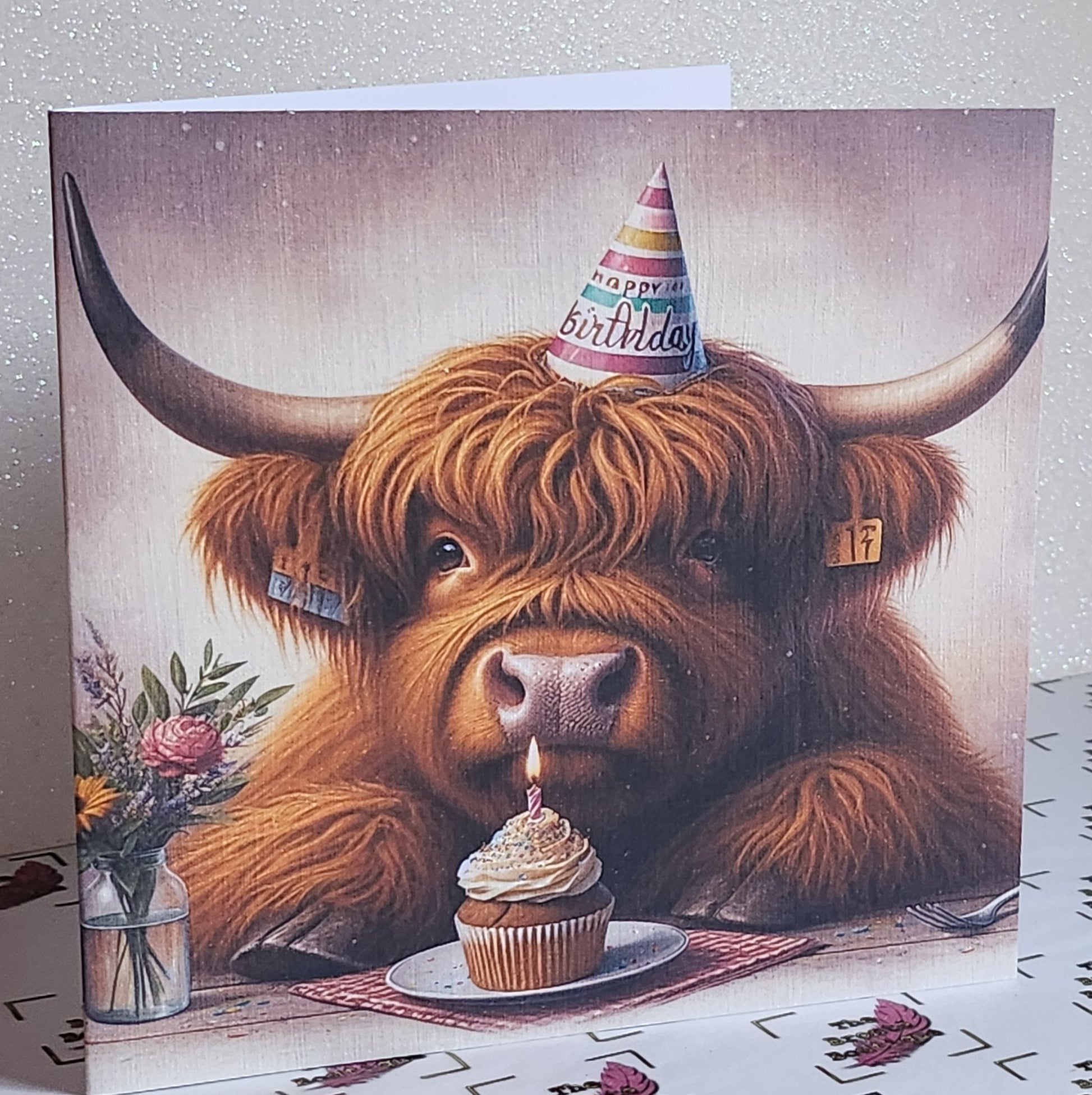 Highland Cow Birthday Card Highland Coo With Birthday Hat And Cupcake Handmade Linen Effect Card Square Free Delivery Highland Cow Friend