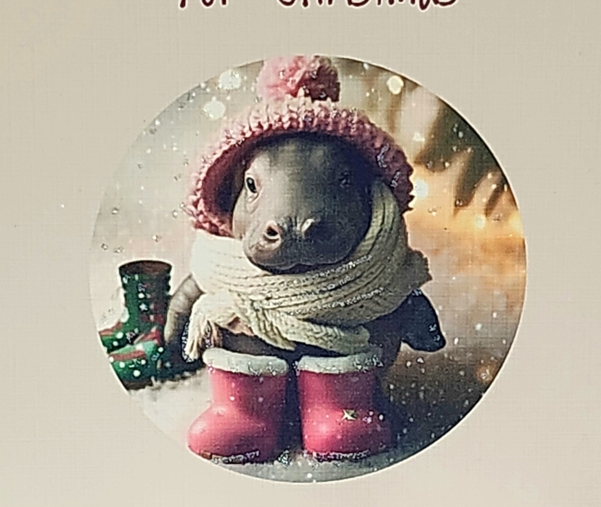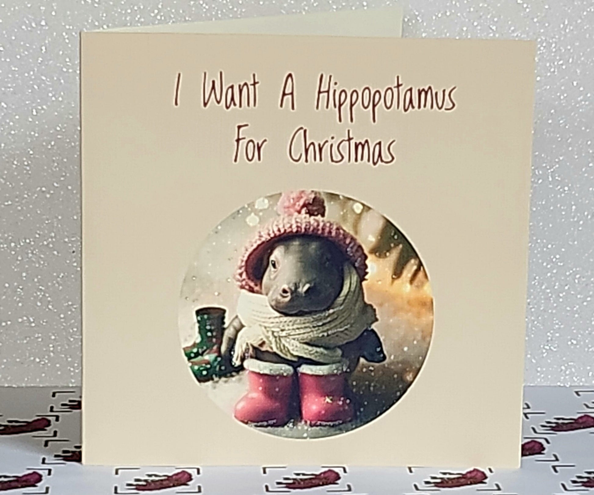 Hippo Christmas Card ' I Want A Hippopotamus for Christmas' Baby Hippo Wearing Bobble Hat And Pink Wellies With Glitter White Free Delivery