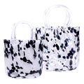 This stunning and unique Dalmatian print handbag vase is available in both large and small sizes. Made from handblown glass it's black and white speckled design makes it versatile, fitting seamlessly into any room or colour palette. Whether you want to display bold, vibrant flowers or use it as an eye-catching piece of decor, this unique vase is perfect for either scenario.