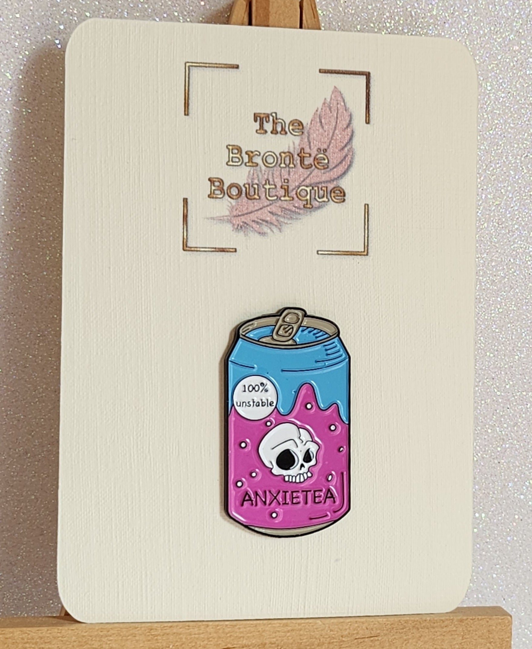 A gorgeous badge to give to a friend in need of a positive boost. This lovely enamel pin badge is in the shape of a drinks can with the wording 'Anxietea' on it. It is set on a cream linen effect gift card. A cheeky and thoughtful gift for someone who needs a bit of encouragement and a virtual hug.