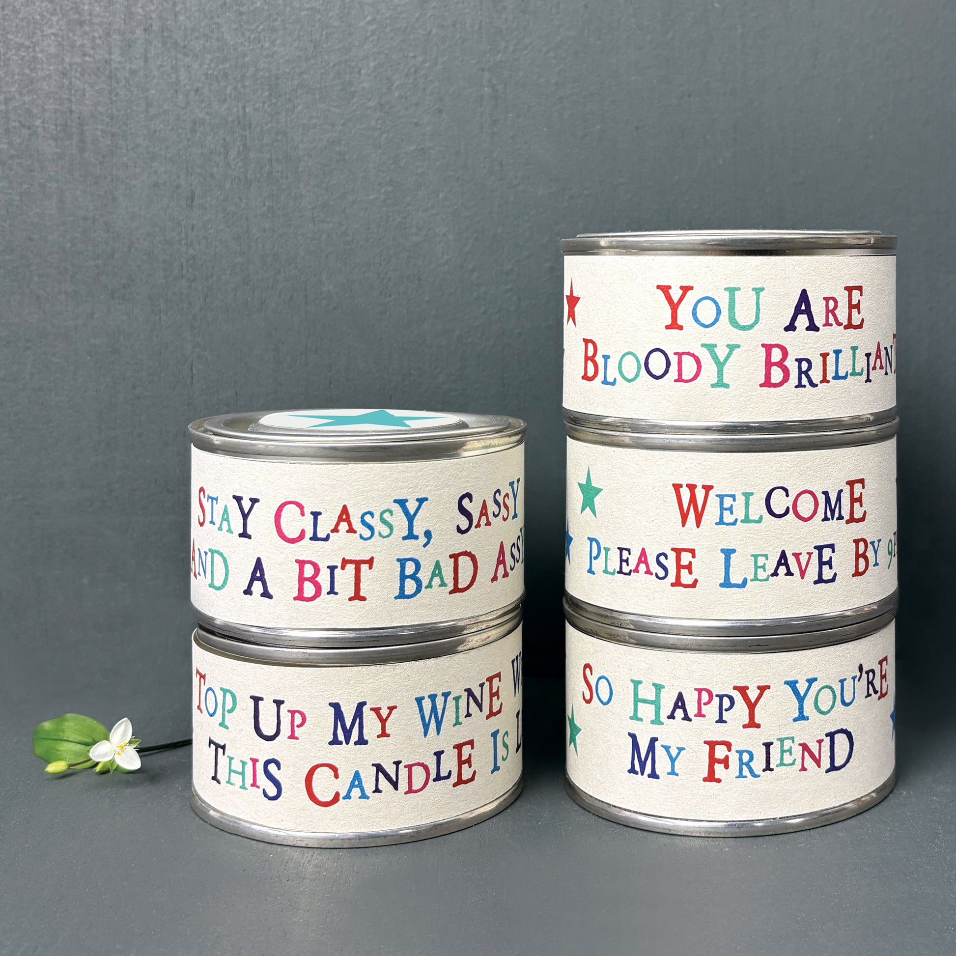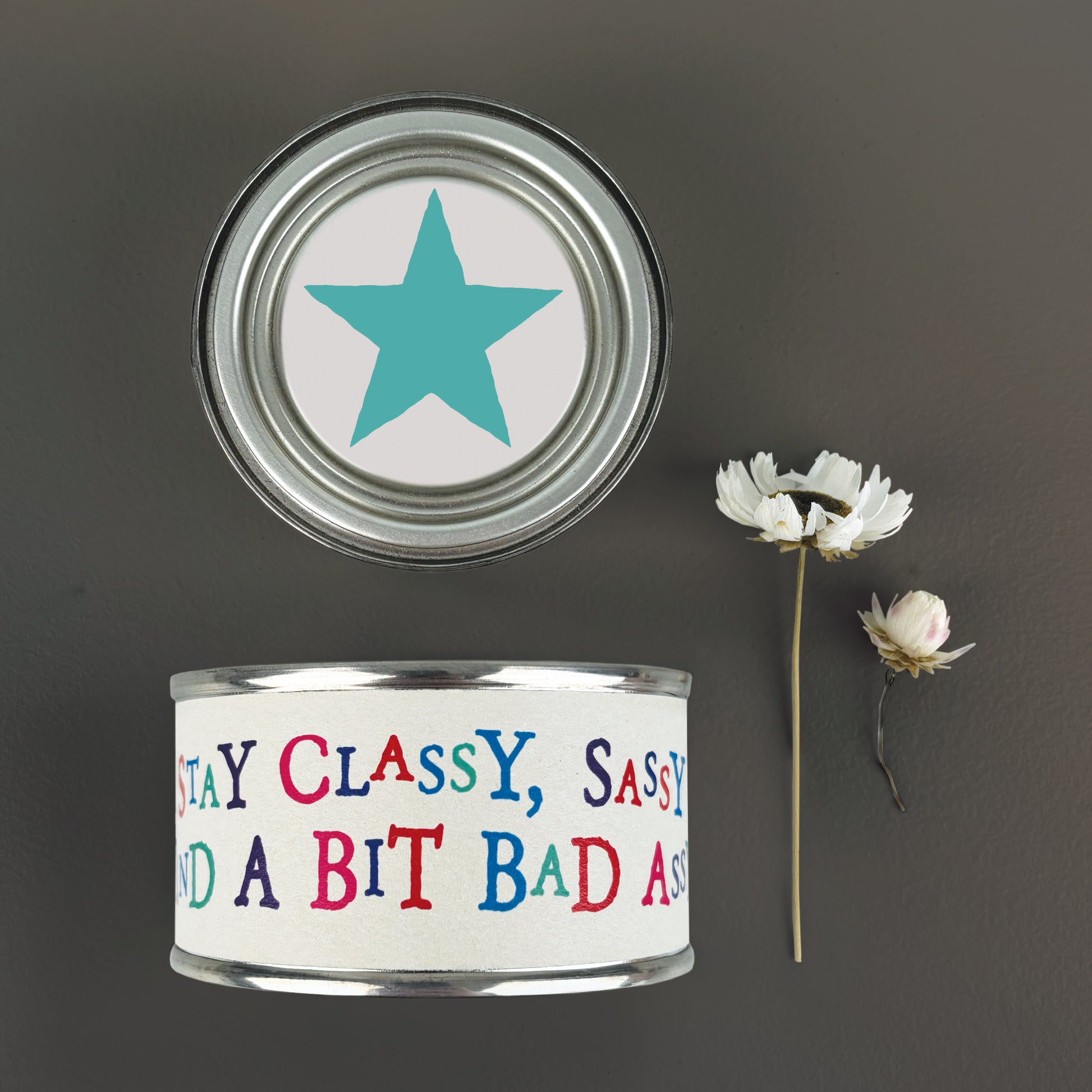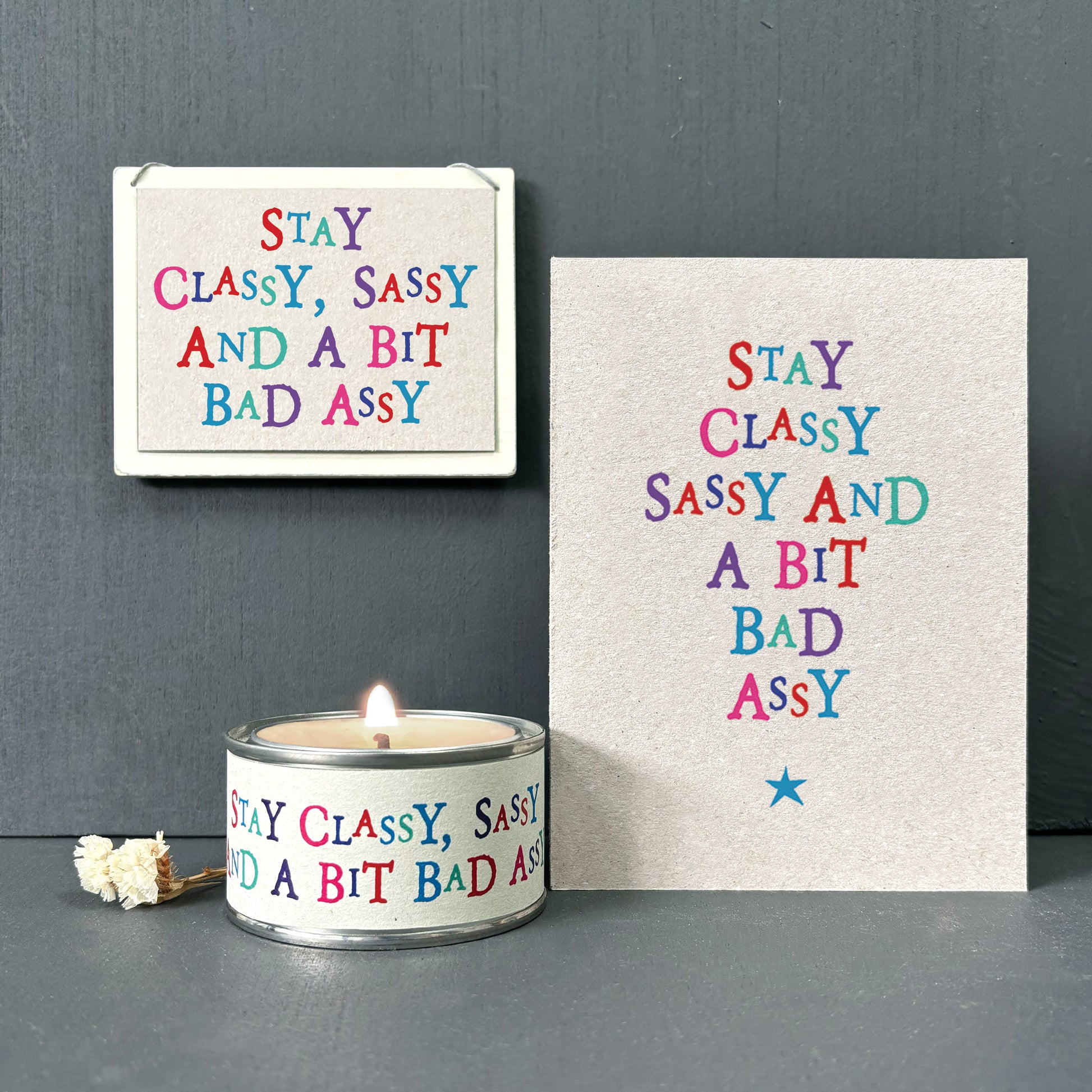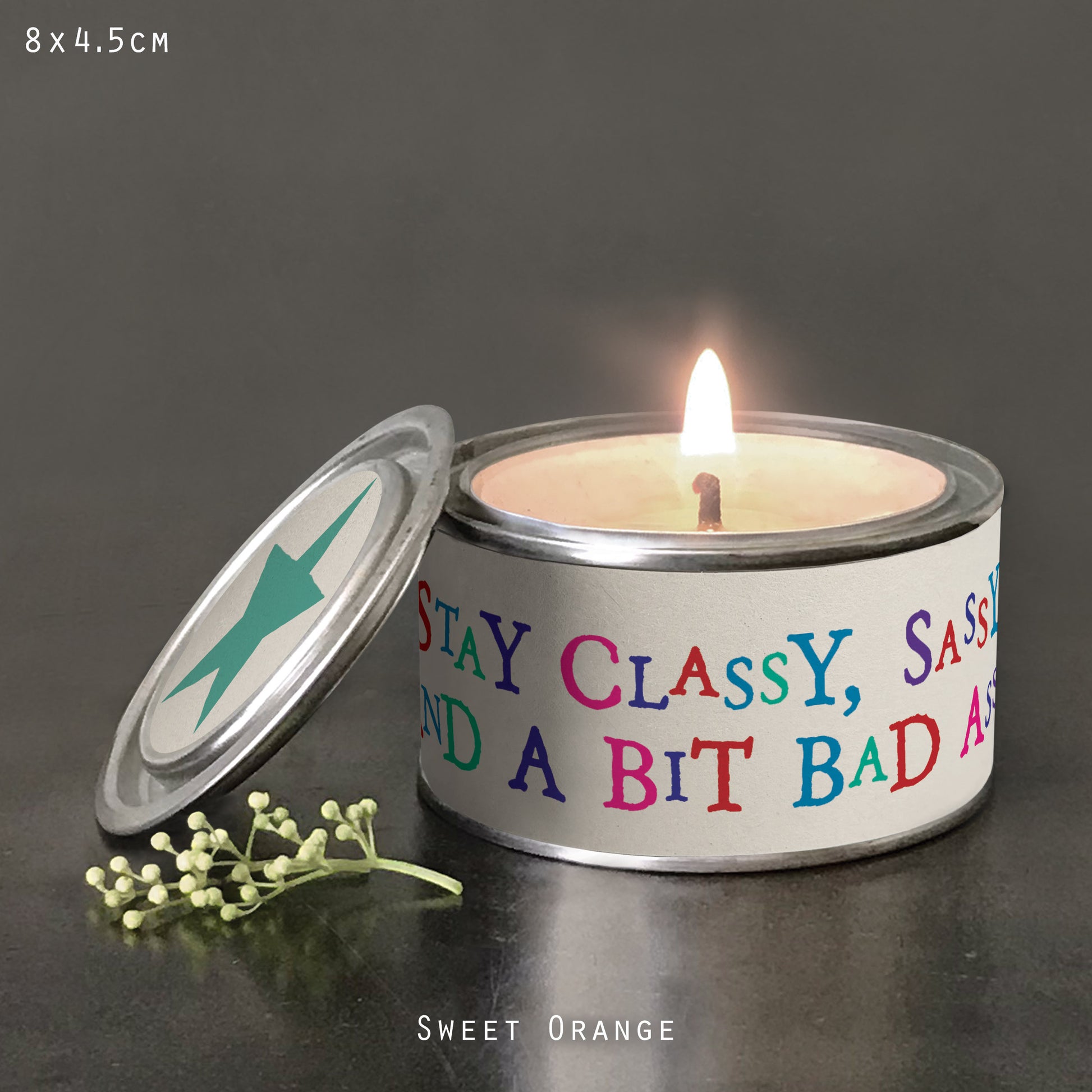 Scented Candle In Tin 'Stay Classy, Sassy & A Bit Bad Assy' Sweet Orange Fragrance East Of India Wonky Word Candle
