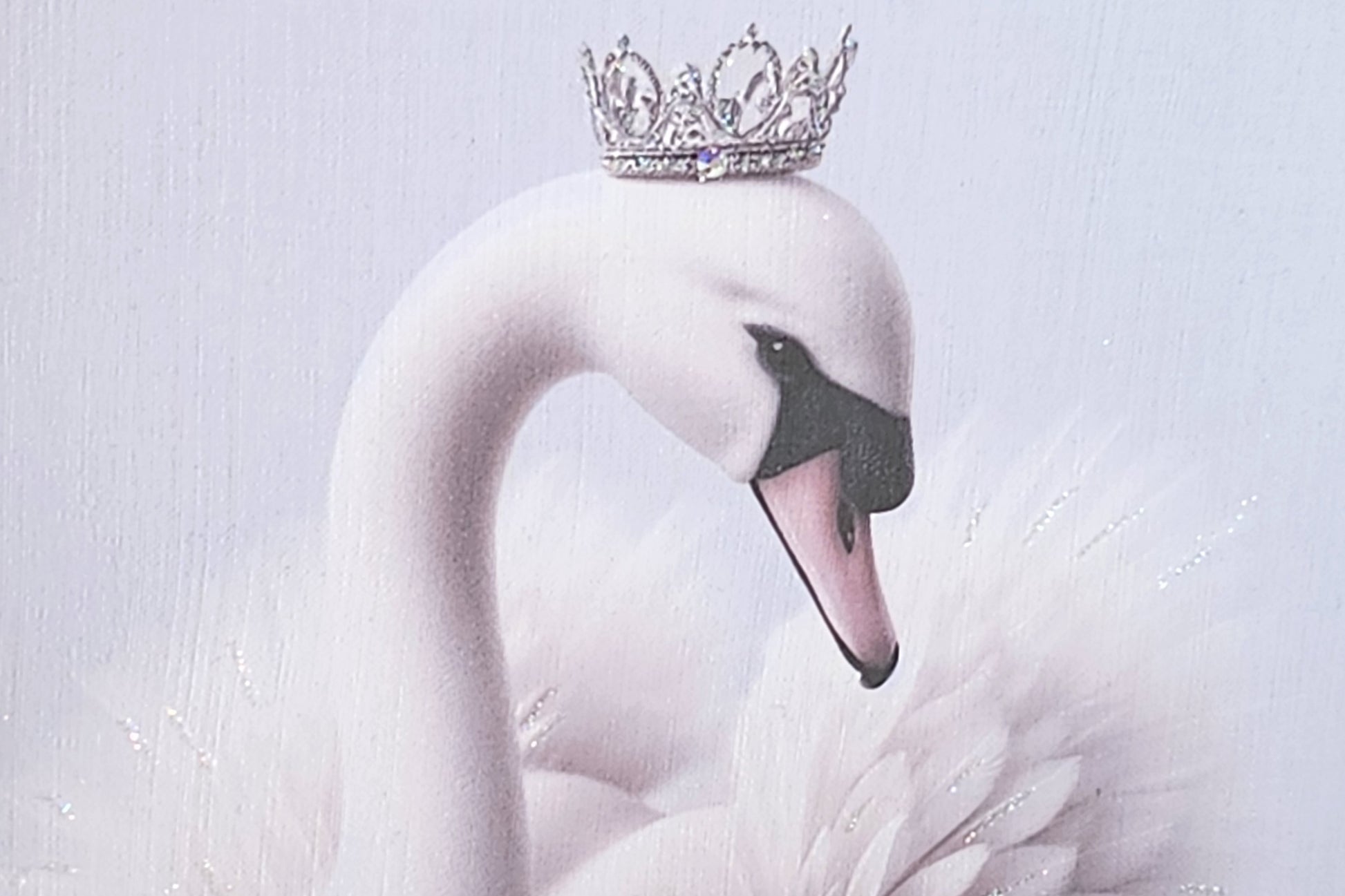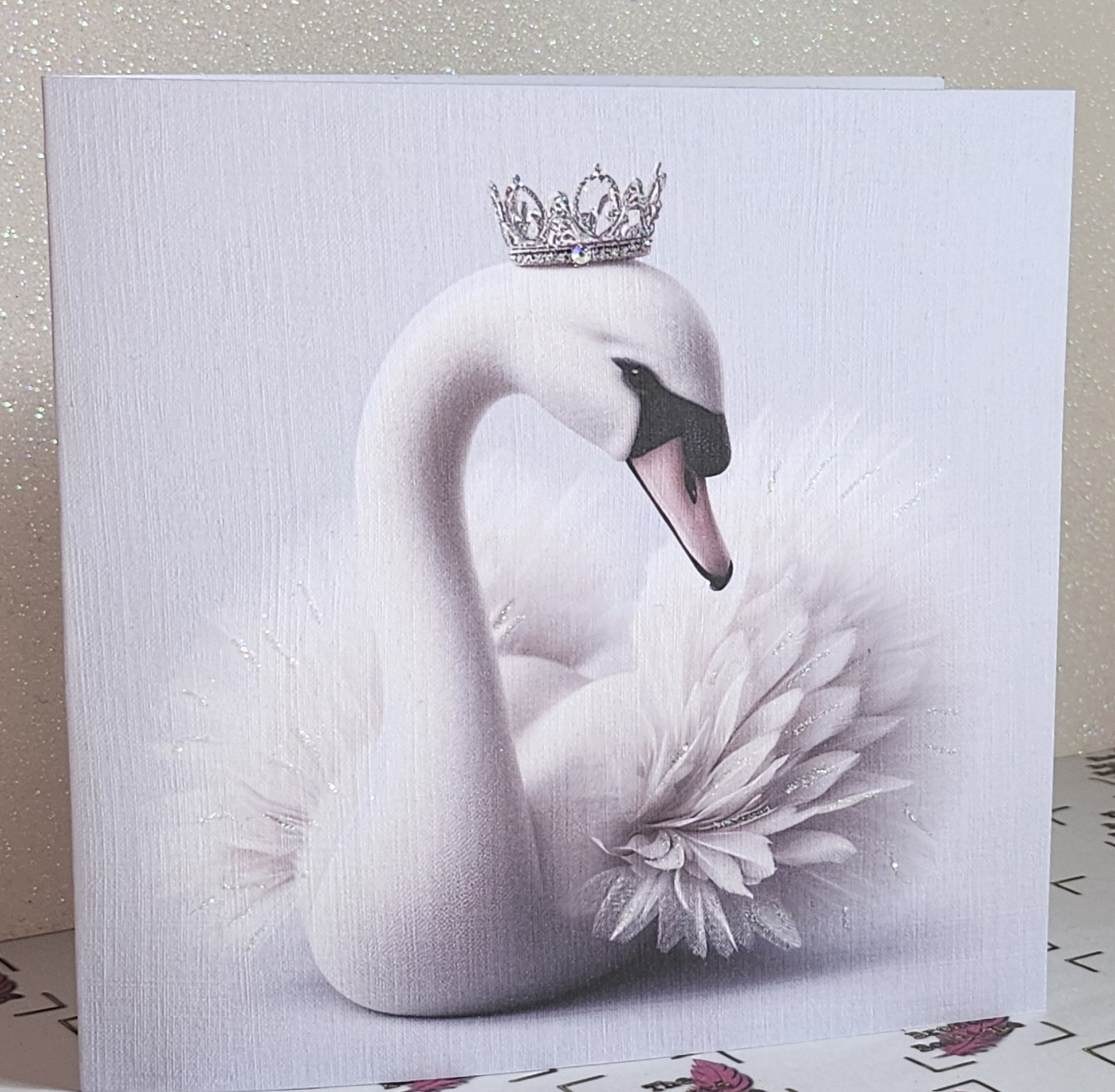 A simply unique and gorgeous card to wish that special someone a Happy Birthday. The white linen effect 300gsm card measures 150mm x 150mm and features a beautiful swan wearing a crown embellished with a genuine Swarovski flat backed crystal and glitter. I am thrilled to say that this stunning design is unique to The Bronte Boutique.