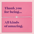 Designed to celebrate the special people in our lives, this gorgeous bracelet is an ideal way to tell that special someone just how amazing they really are. The bracelet features a delicate silver-plated star charm on an adjustable cord, paired with a vibrant pink backing card that reads 'Thank you for being… All kinds of amazing.' This lovely bracelet is adjustable to fit most wrists. A unique and beautiful gift.